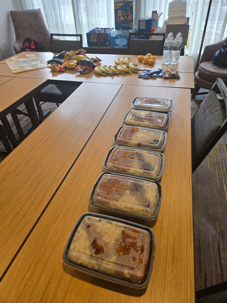 The next two days, I fed people in a hotel in a suburb about a half-hour away. I worked in a room off the lobby with another volunteer who was from the Twin Cities area. The Red Cross usually has people work in pairs for safety and to help with information exchange. My partner showed me the ropes. We arrived before lunch and got the room ready for the meal distribution by putting out supplies stored there (like fruit, water, granola bars). When the hot meals were delivered (in to-go containers), we’d set them out and open the room doors so that residents knew meals were available.