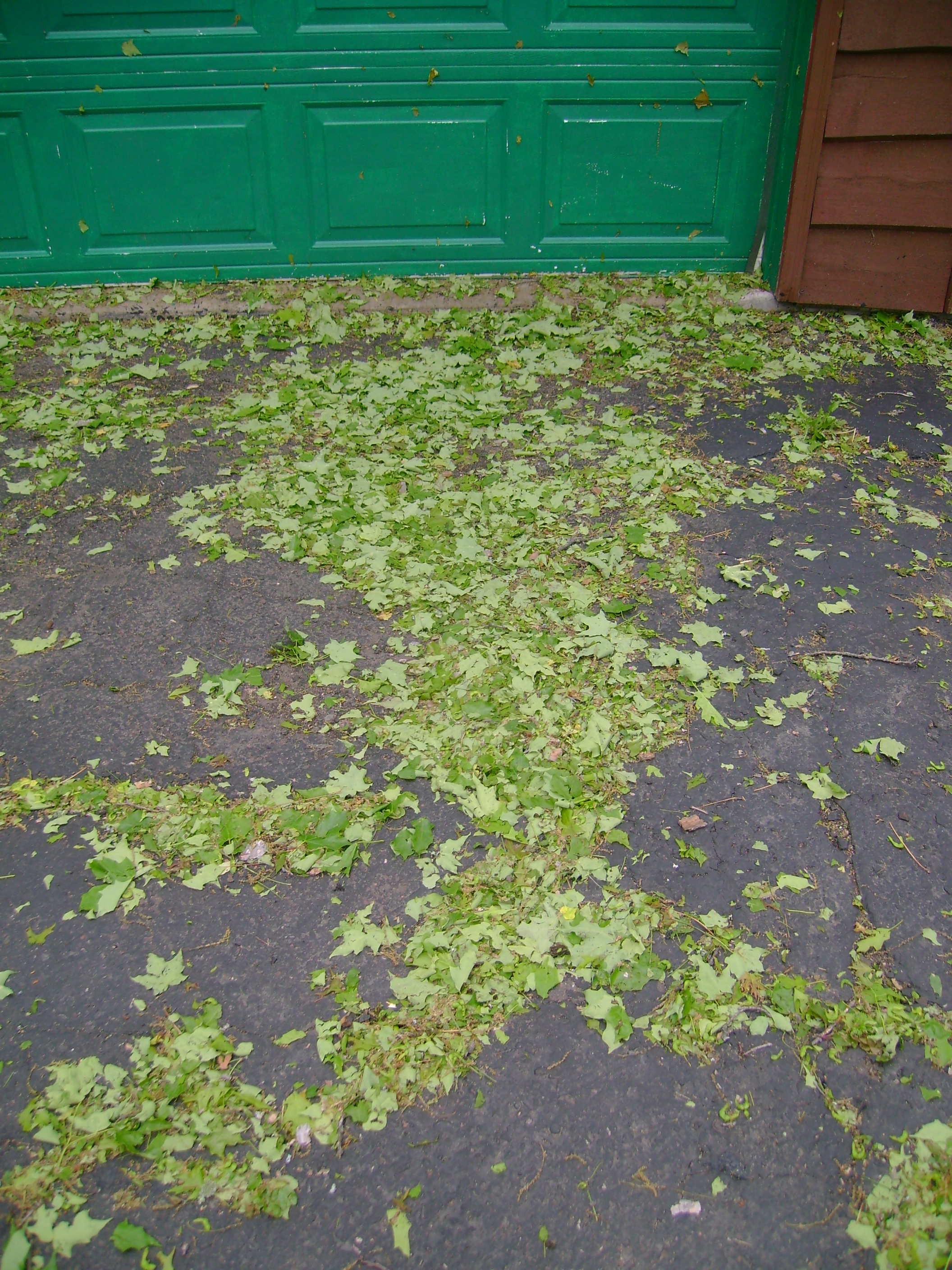 Even though it only lasted a few minutes, the hail squall that passed through my neighborhood earlier this week did a respectable amount of damage. Winds up to 70 mph toppled stately trees, people lost power – some for up to 22 hours (I lost power for about 12), and hail shredded the leaves that had finally popped out on the trees, creating a green carpet over people’s driveways and the roads.