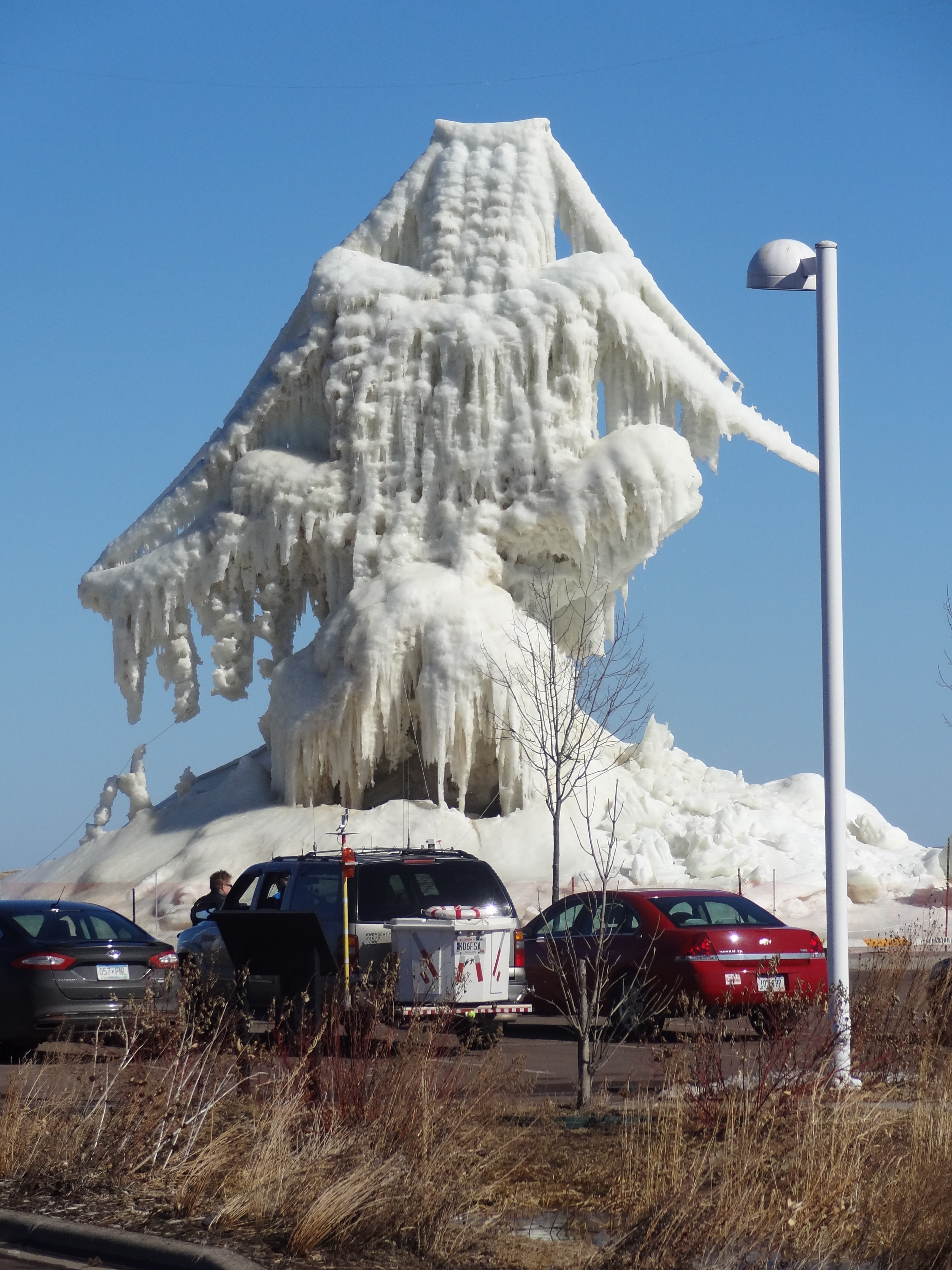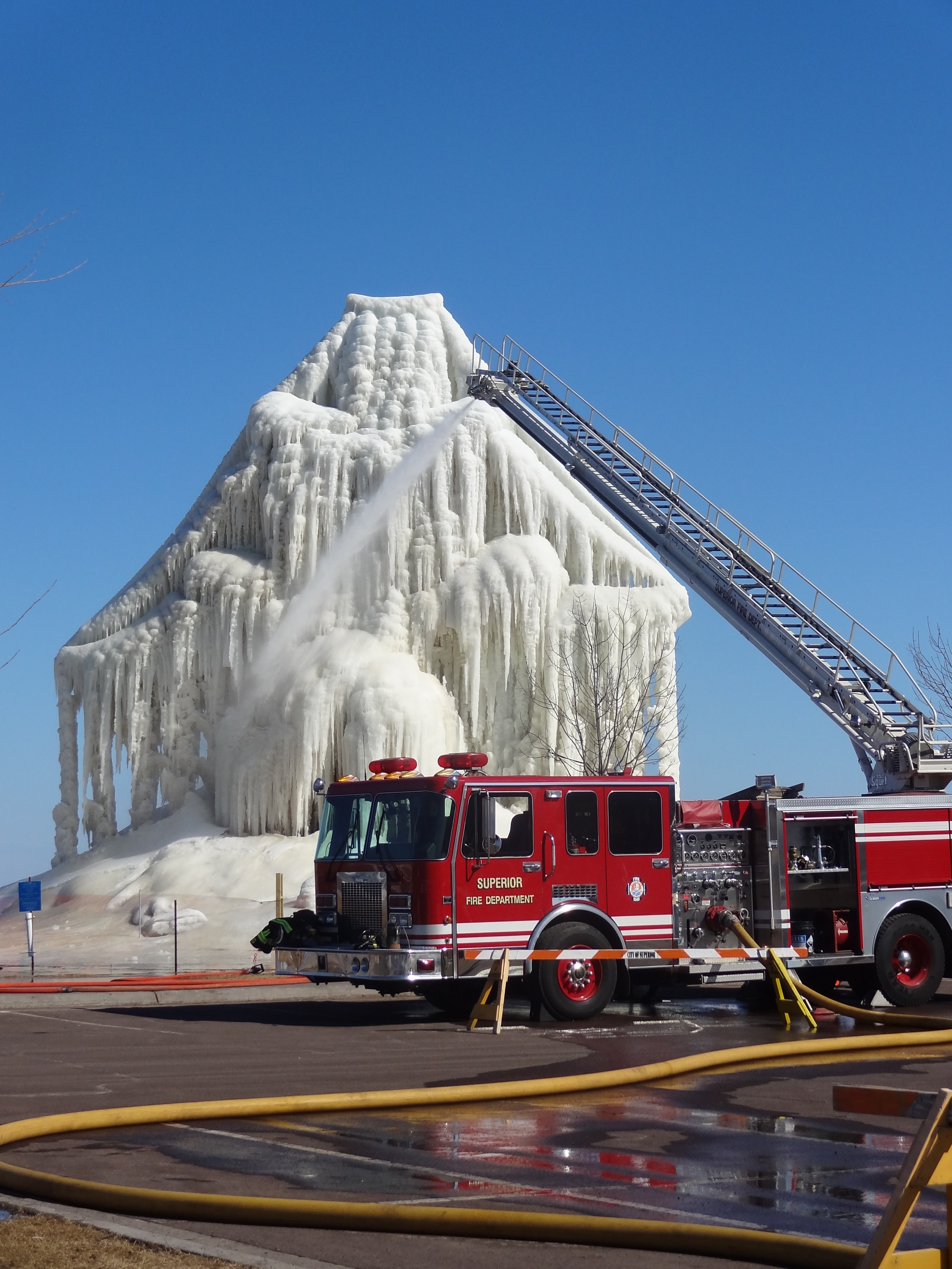 Yesterday, crews from the Superior Fire Department sprayed the formation with a hose to knock it down. Funny thing was, although the formation seemed to get skinnier, no knocking occurred. Ice Man Roger Hanson apparently did his rebuilding job too well, and now his creation can’t be destroyed!