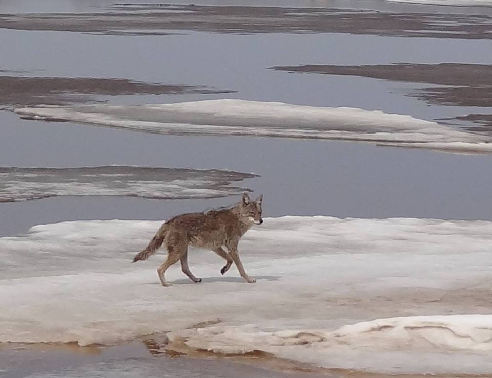 When I was eating at the restaurant, never in my wildest dreams did I think I would one day work in the building, but as fate would have it, here I am, right in the spot where I ate lake trout with friends. I have two banks of windows that look out on the water. Although I assure you I spend most of my time staring at my computer screen, the windows have afforded plenty of opportunity to see other things in my three years here – like the coyote who crossed the ice from the mainland one spring, or the fox who heard a mouse underneath the deck and kept trying to pounce on it (see video here), or the family of otters cavorting in the water, or the disabled gull , or a young common tern begging its parent for food, or woodchucks sunning themselves on the deck, or the bear who walked through the parking lot.