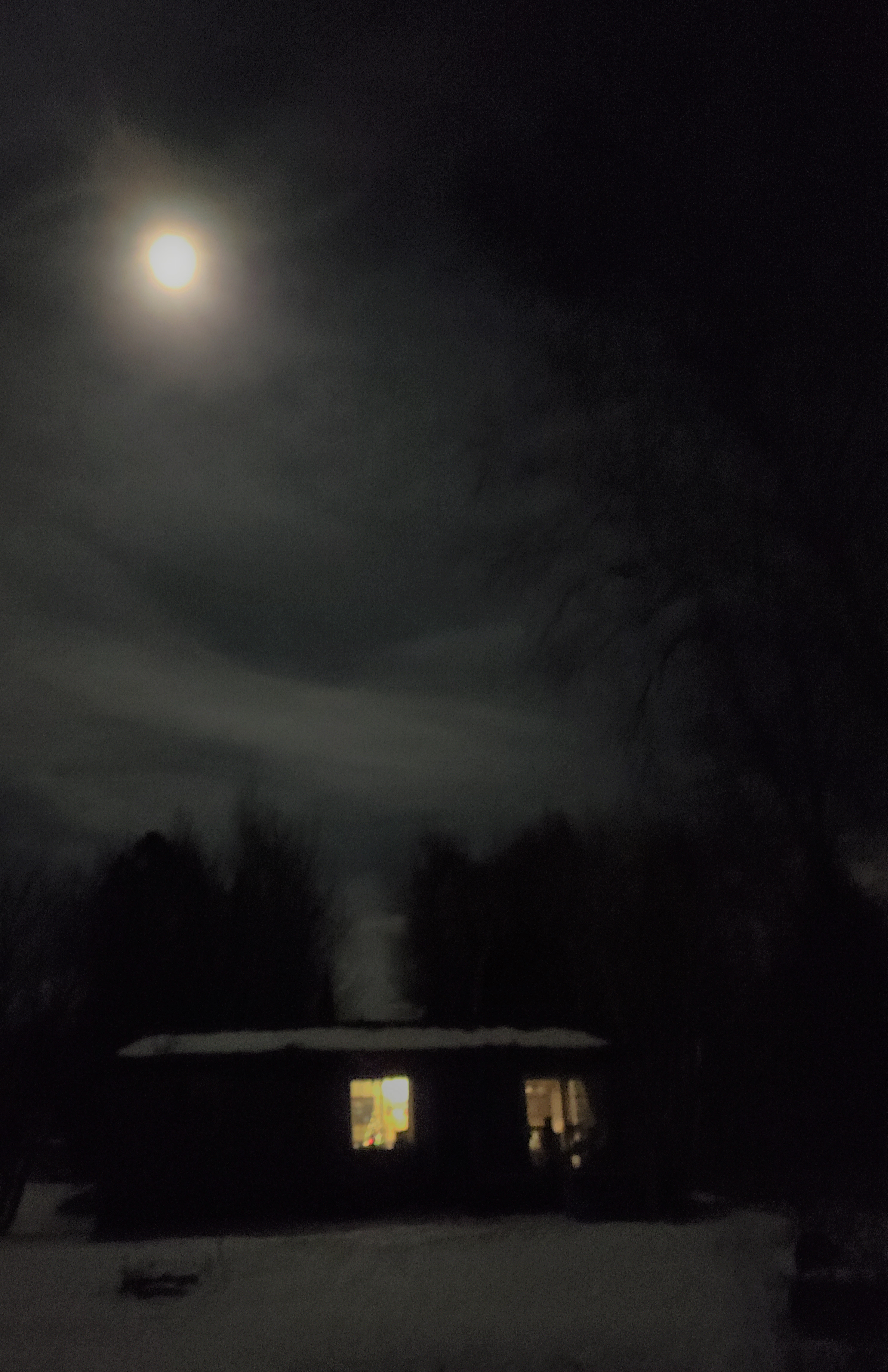 We snowshoed past this cozy cabin with a little Christmas tree in the middle window. You can almost see the tree in in this night-blurry photo. Silent night. Inspiring night….