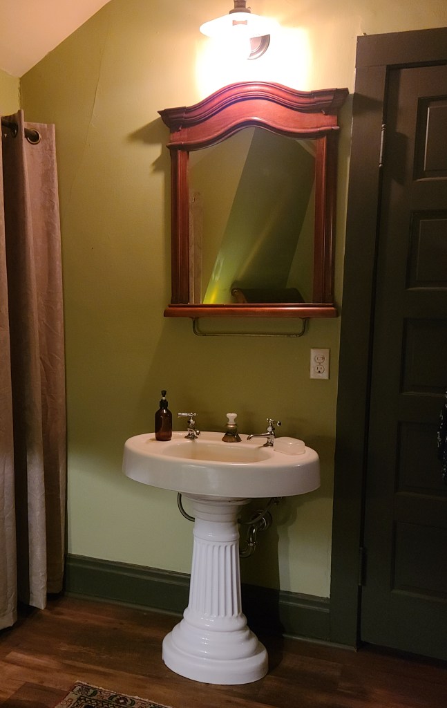 The nice young man (it’s so typical that we know the dogs’ names but not the human’s name!) took us back outside, past the large courtyard with a fountain and gardens, and showed us our room in the carriage house, explaining this was where all the men on the household staff slept because the Carpenters had a daughter they didn’t want sullied by male influences.