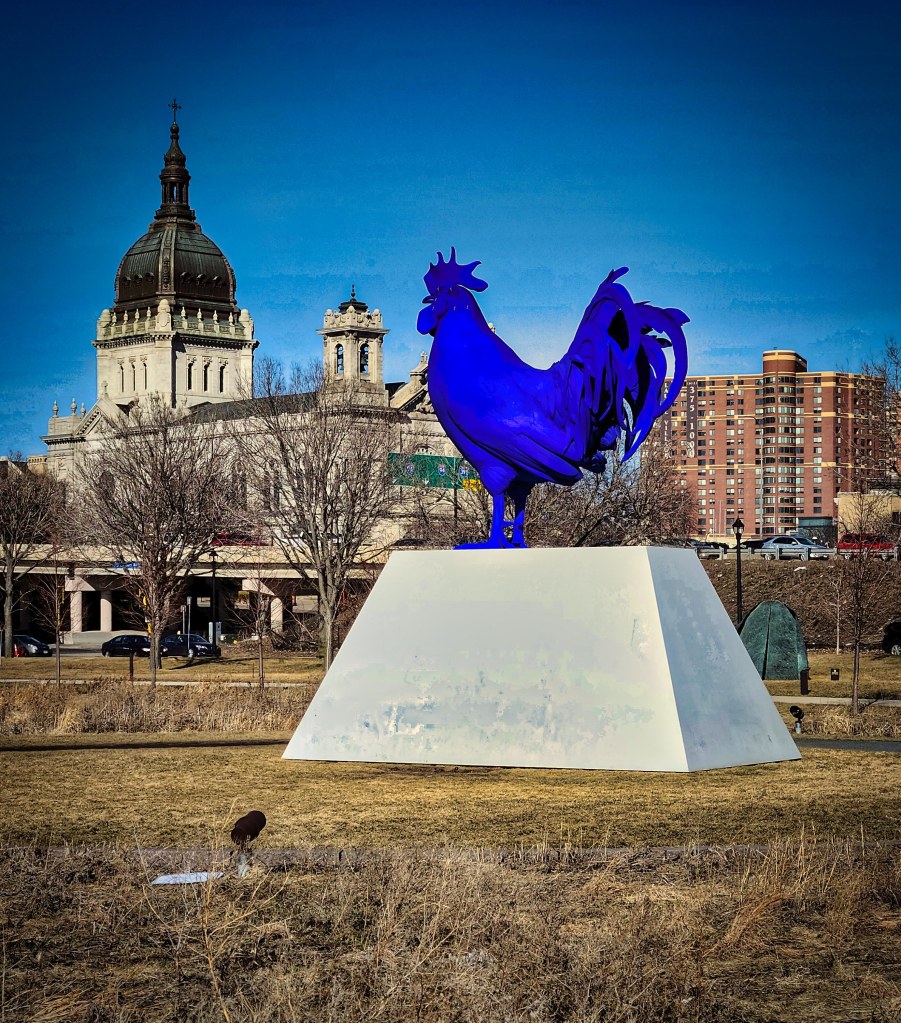 Its sign says, “The rooster can be a symbol of pride, power and courage, or posturing and macho prowess. Fritsch has admitted that she enjoys ‘games with language,’ and the sculpture’s tongue-in-cheek title knowingly plays on its double meaning. Like Spoonbridge and Cherry, Hahn/Cock presents an unexpected take on the idea of a traditional public monument. Together, these two landmarks show how ordinary objects can become iconic and deeply symbolic.”