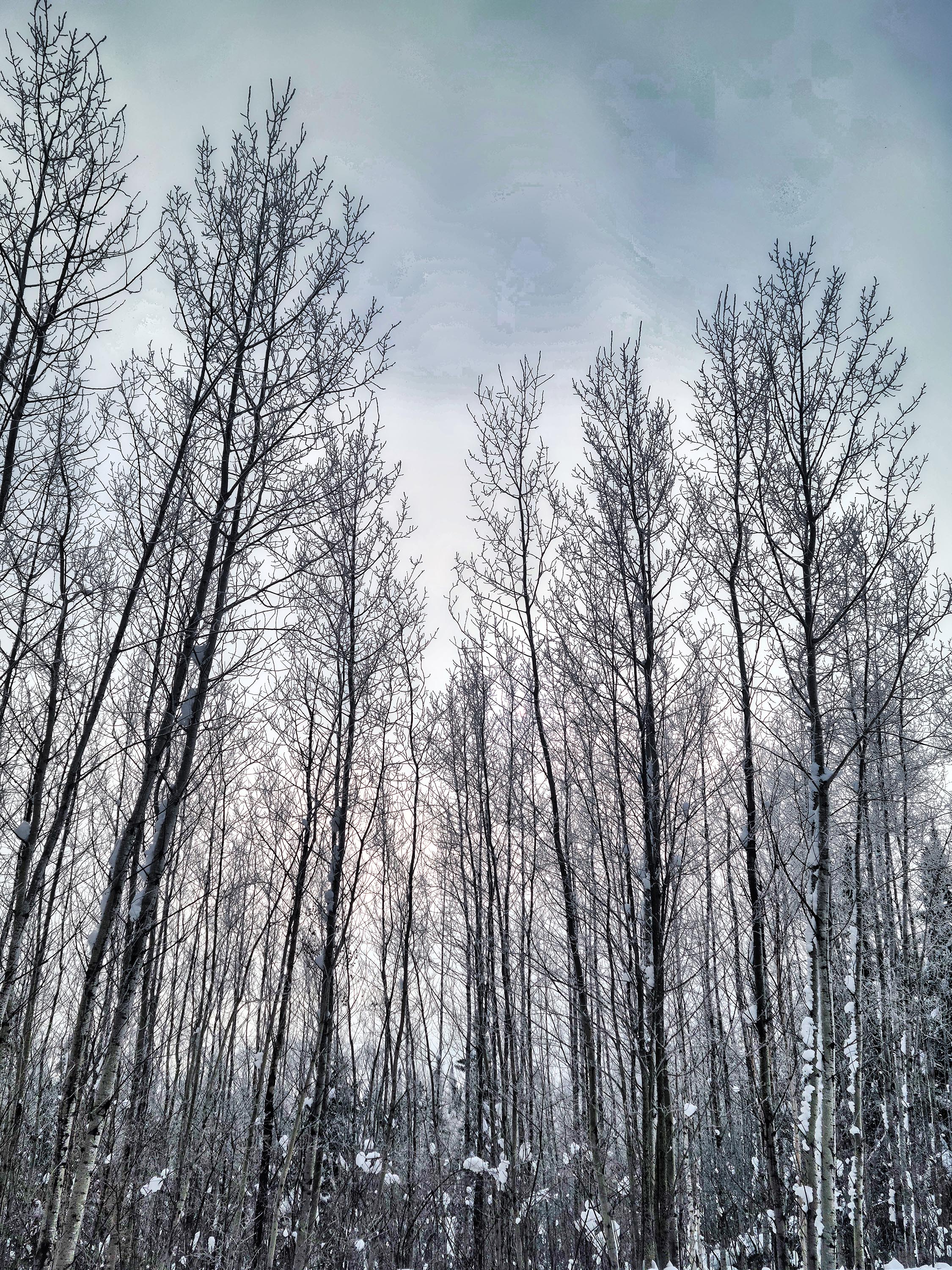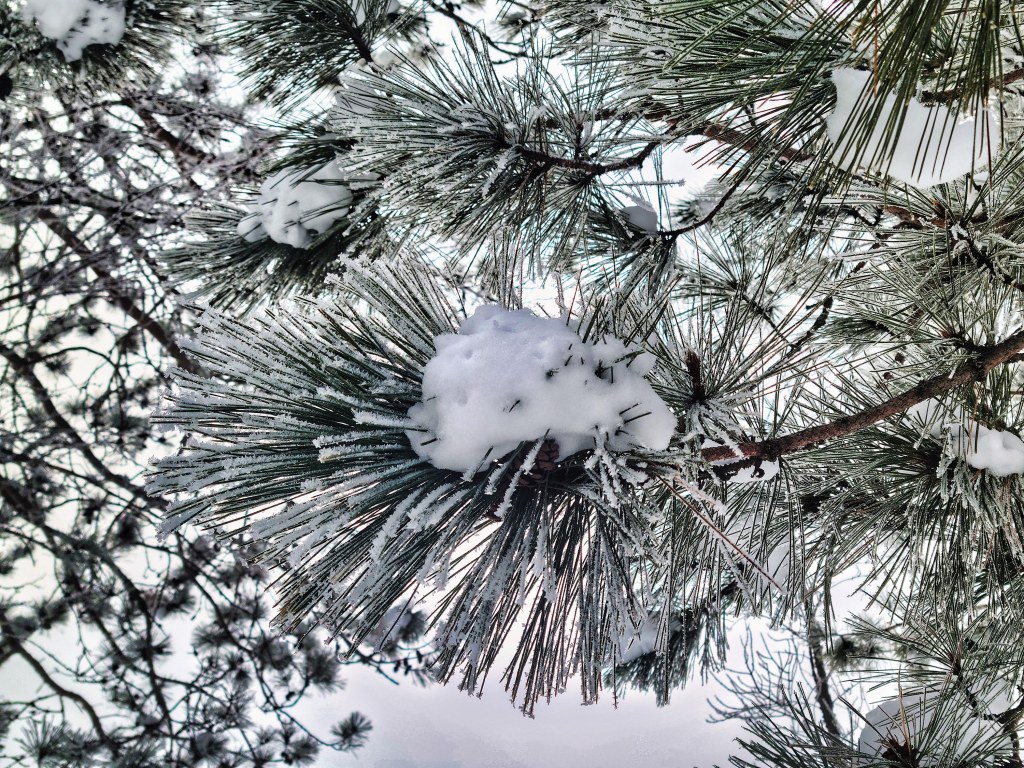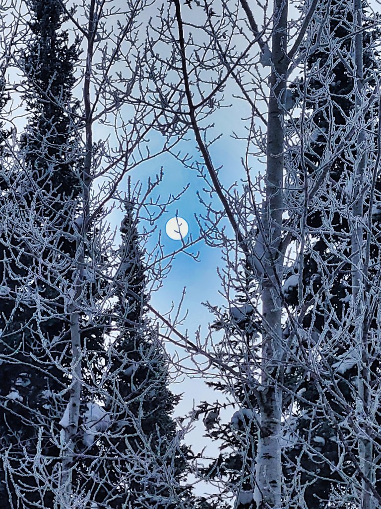 A morning fog descended upon our cabin deep in the north woods, outlining the barren trees with frost. The birds stilled. The sun pushed through, a white disc more like the moon. I walked the wide road, a witness.