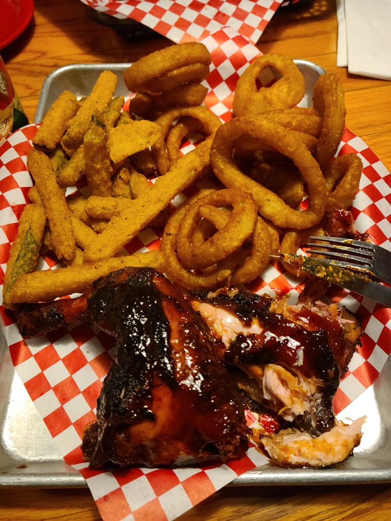 Like on my previous trip, we ate lunch at Bobby D’s BBQ. This time, it was Russ’s turn to sit in the “haunted booth” where a former restaurant owner died. Despite this unappetizing tale, we heartily enjoyed our lunch of BBQ chicken, ribs, onion rings, and zucchini fries. They make the BBQ sauce on-site. Our favorite of the four was the jalapeno, molasses and brown sugar one. Zippy but not too spicy, even for us Minnesotans.