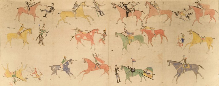 According to the museum, this art form began in the late 19th century when several Great Plains tribes were relocated to reservations by the U.S. Government. Many of their cultures had traditions of recording events on animal hides using natural pigments. Faced with imprisonment for practicing their cultural traditions, the Natives turned to the materials they had at hand, which were ledger books and colored pencils, provided by traders and government agents.