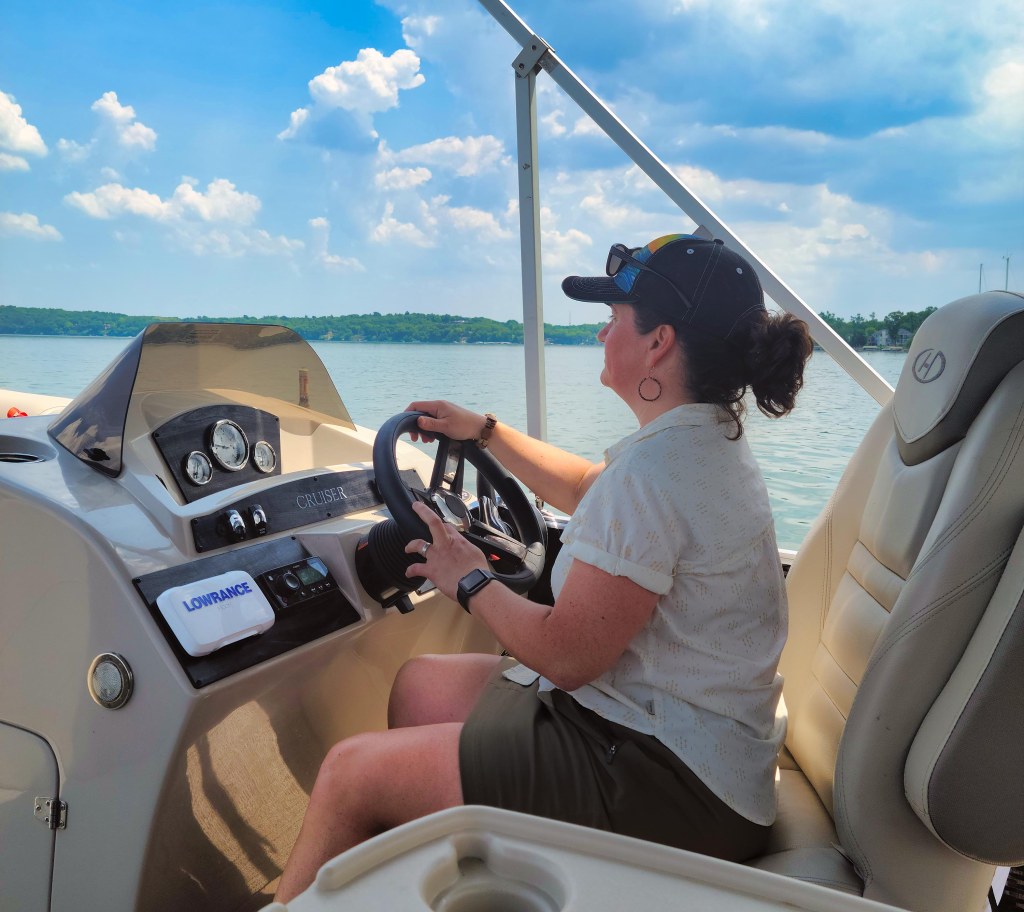 In stepped Sarah, our graphic designer. She had never piloted a pontoon boat before, but she had experience sailing, so we figured she was the next best thing. I could have possibly done it, too, but was happy not to have the responsibility since I am unfamiliar with the lake.