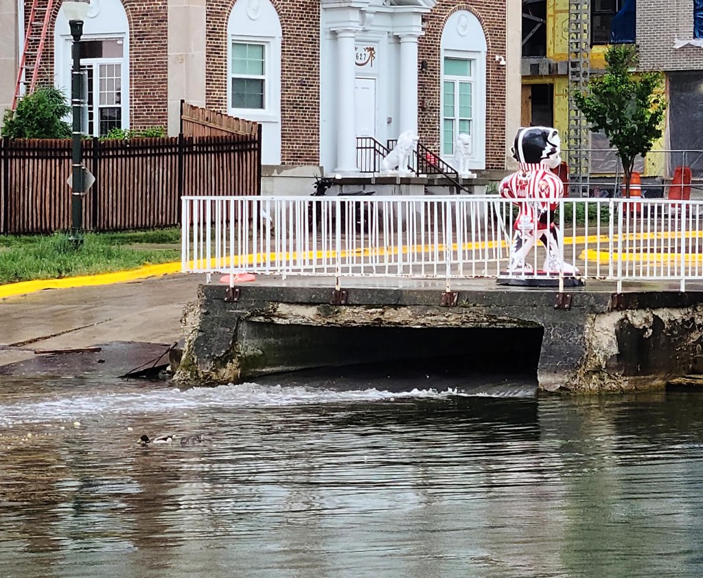 Stormwater gushes out into Lake Mendota underneath the college’s mascot, Bucky Badger. Note the mallard headed into the stream.