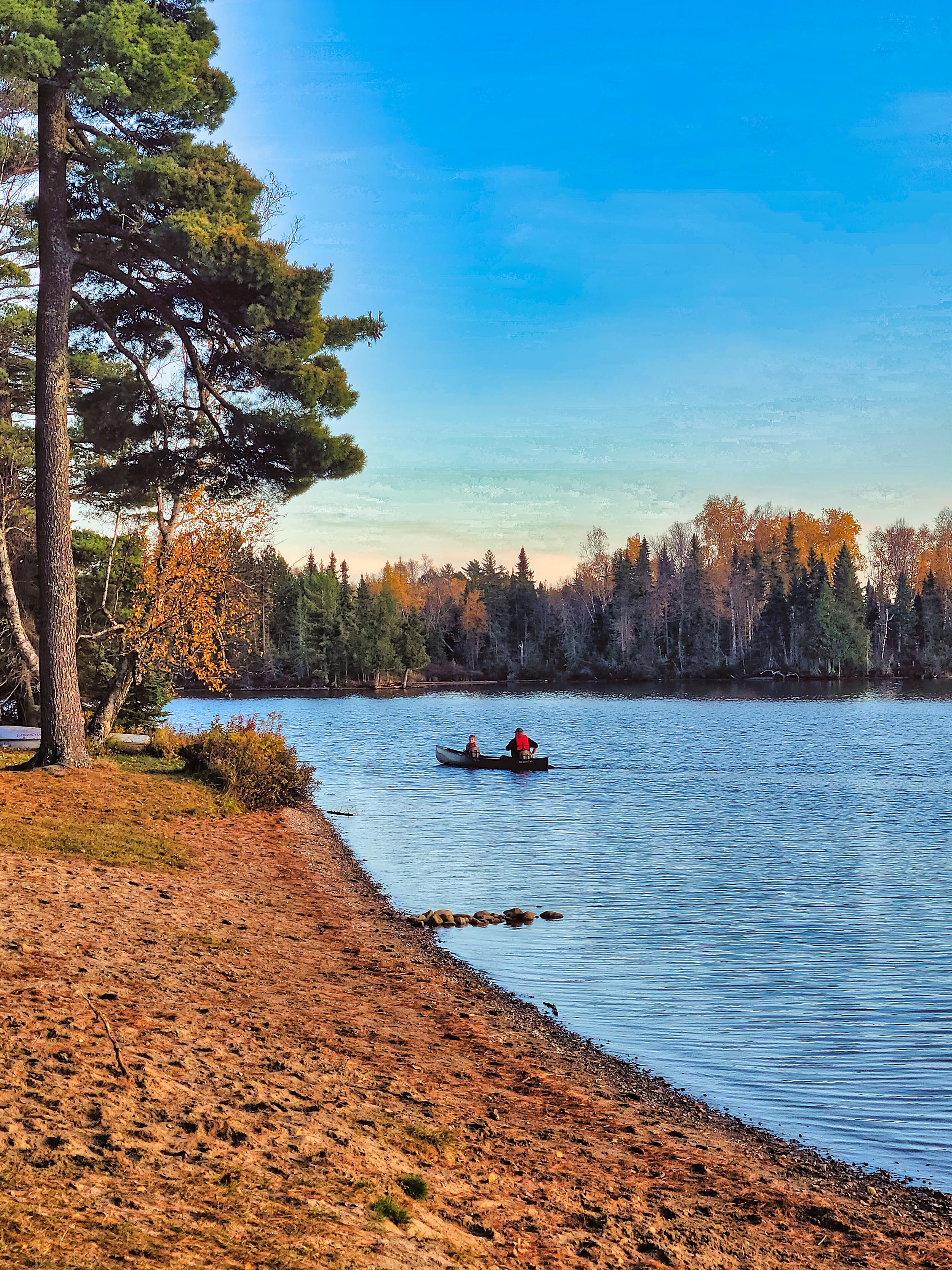 The air was warm for mid-October and the wind was calm. After our Spam and eggs supper, we took a walk on trails along the lake. The tamarack trees and aspens were still clothed in their splendid yellows. The trail ended at a beach surrounded by tall red pines. We’d find out later that these pines were spared during logging times because they were too small to be of interest. Good thing the place is a state park because they’d certainly be of interest to loggers now!
