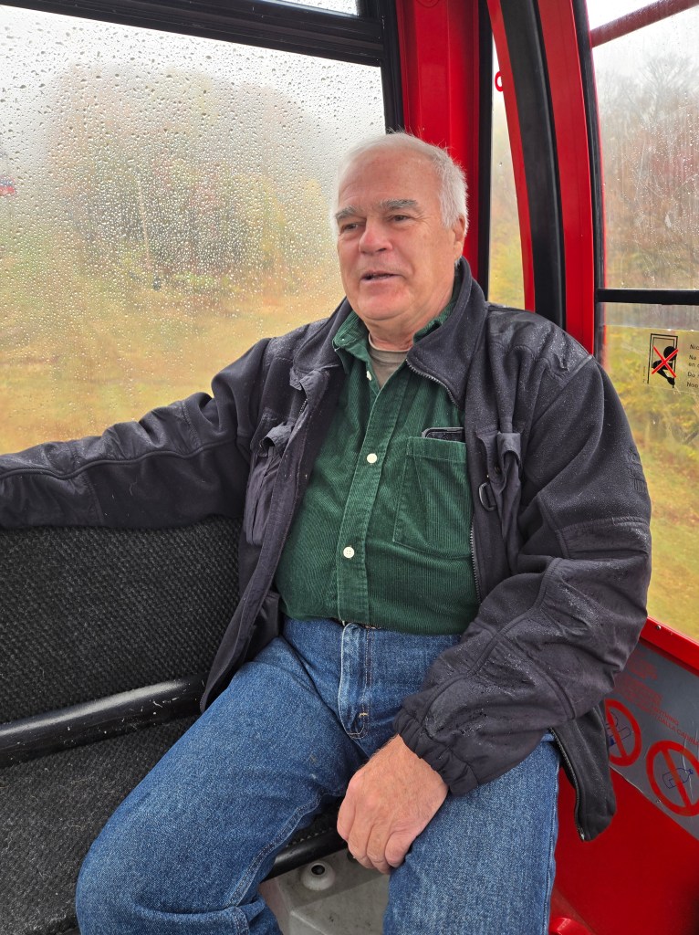 Historian Brian Lindner. He treated us to lunch at the top of Mount Mansfield. Here, he’s in a ski hill gondola on the rainy way up to the restaurant.