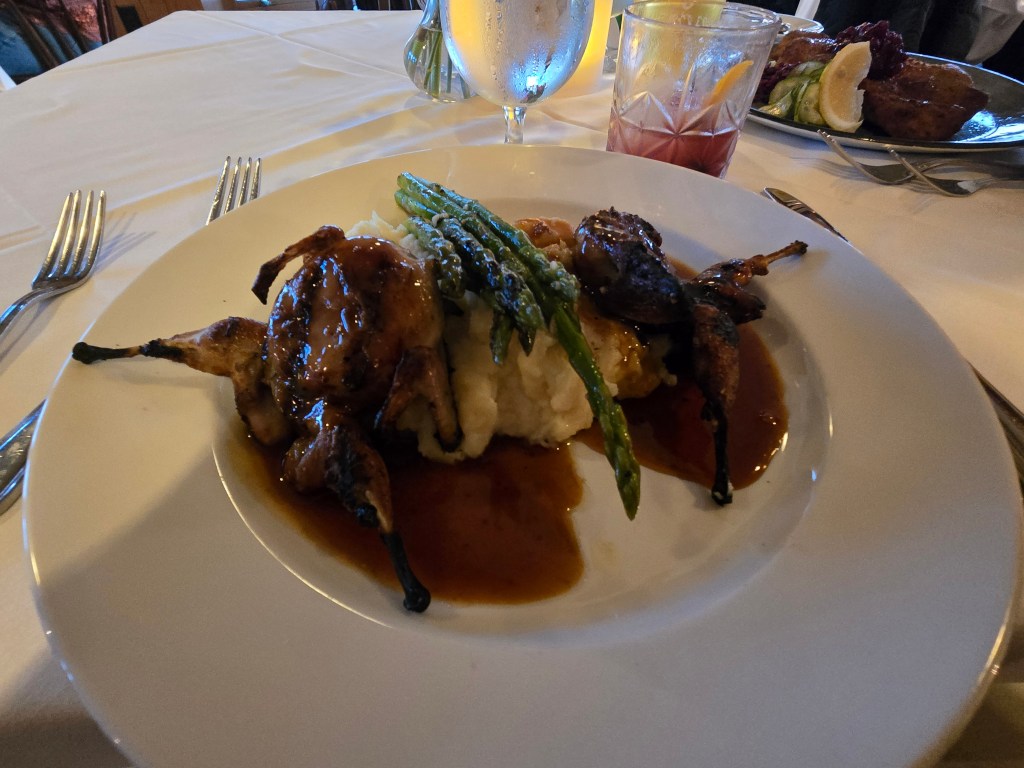 We couldn’t afford to stay at the lodge, and timing wouldn’t allow us to partake in any of the special guest experiences they offer, but we could manage dinner. We made our reservations for their main dining hall a few weeks beforehand. They serve Austrian- and Vermont-themed farm-to-table foods. Russ had the Wiener schnitzel. I ordered a wild game dinner that featured venison and quail. However, they were out of venison, so I got two quail instead! To drink, I had a lingonberry spritz. For dessert, Russ had carrot cake, and I had chocolate mousse with hazelnuts. Everything was divine, and our waiter was attentive.