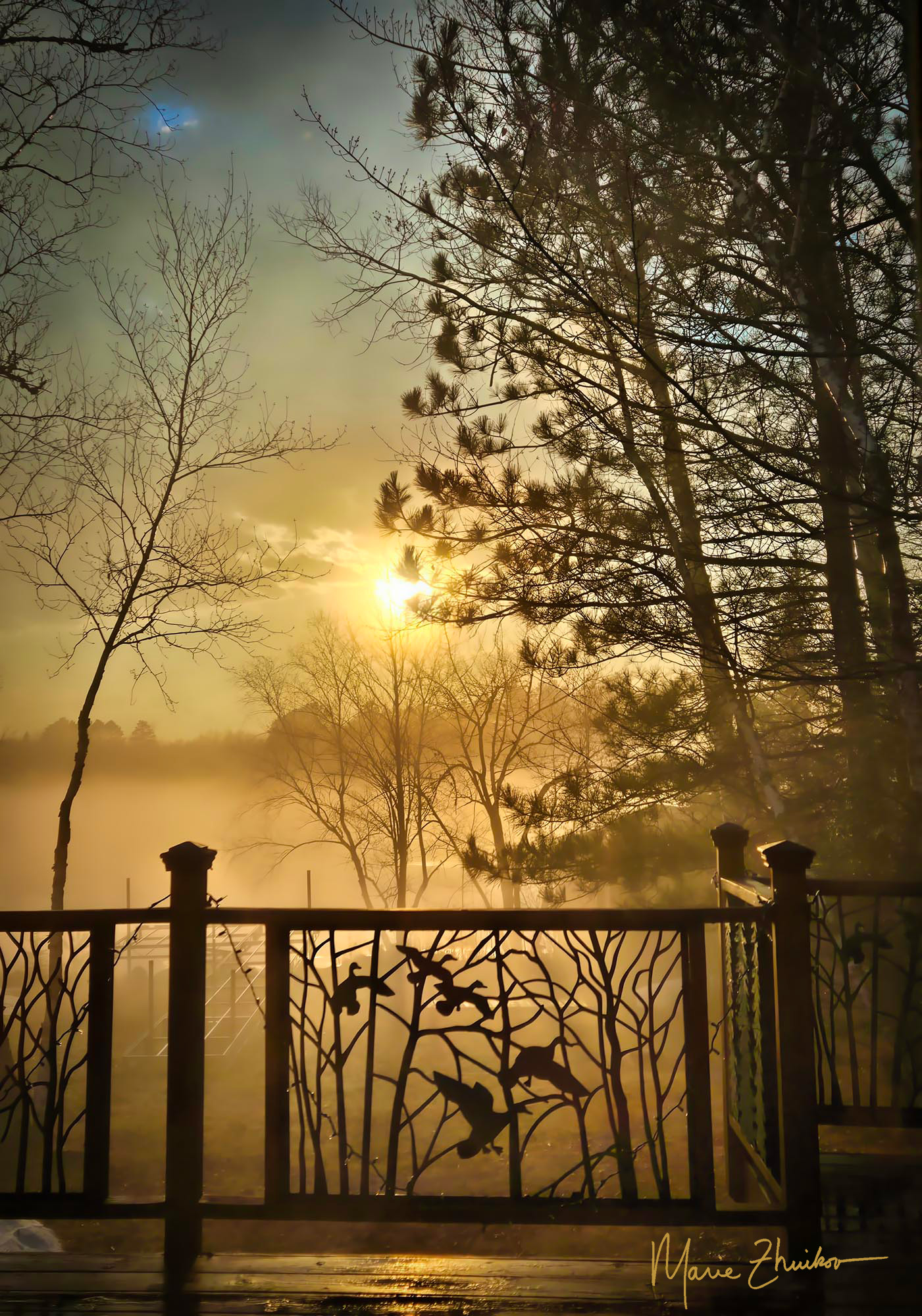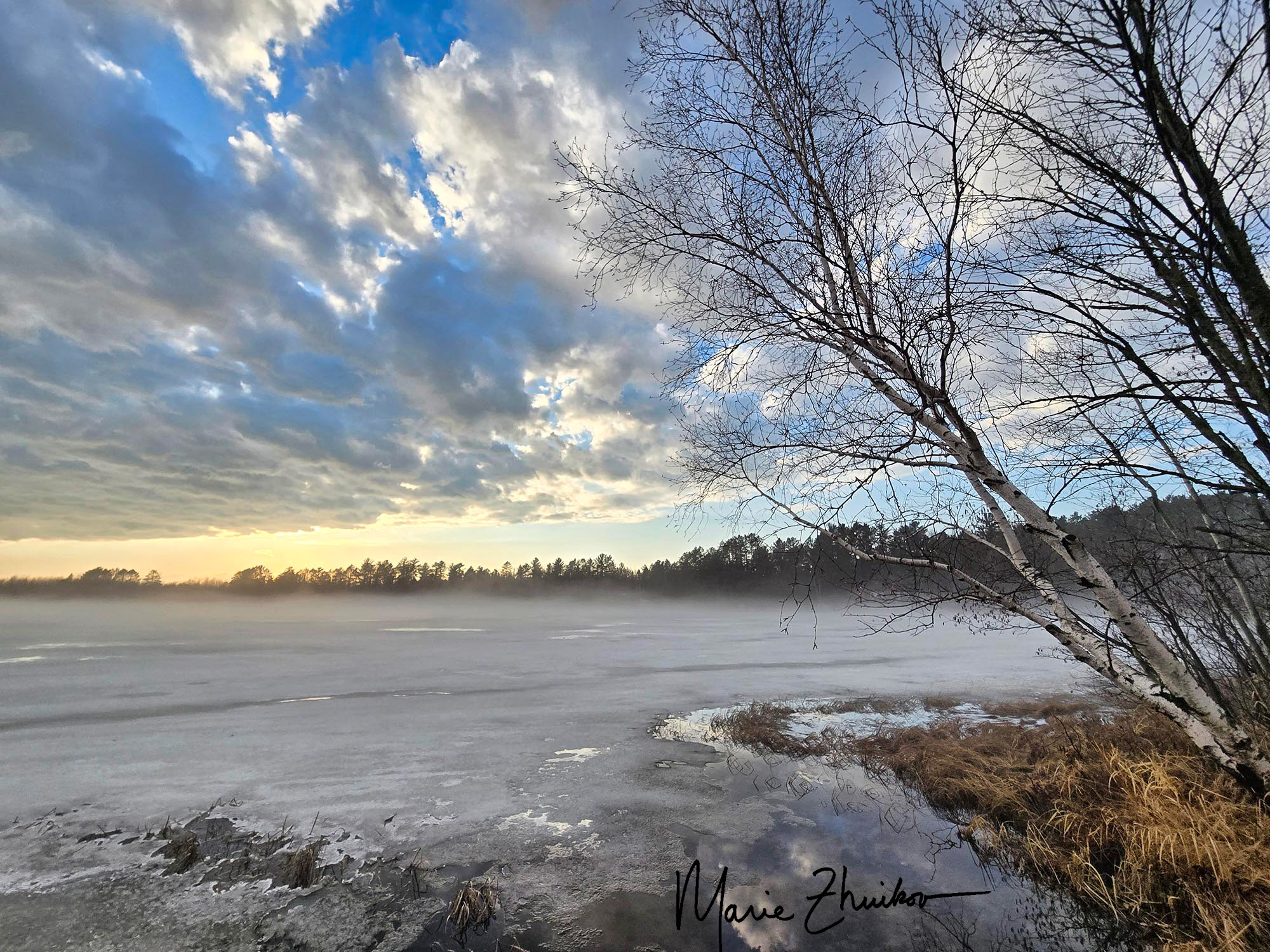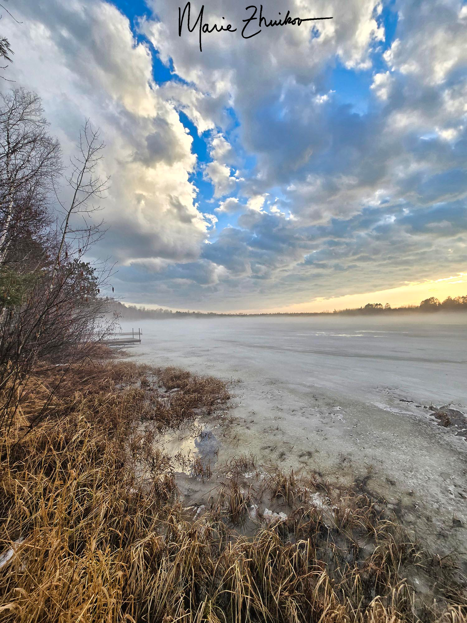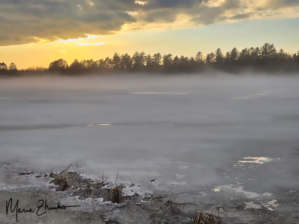 The next weather treat on this crazy day was sunshine. The air temperature shot up from the 30s to near 50 degrees F. The temperature difference between the lake ice and the air formed a mist that added an air of mystery to the landscape.