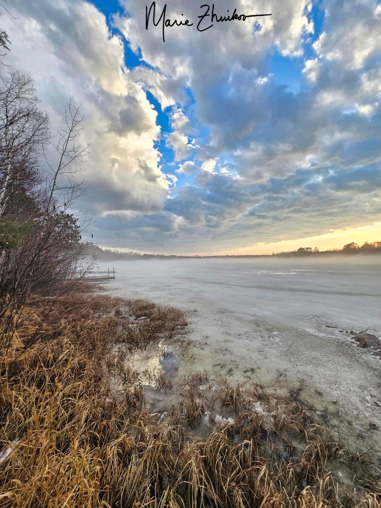 Nope. I was too lazy. Then came another bout of rain, which turned into dime-sized hailstones. We watched them fall from under the safety of our cabin’s metal roof. The hail stopped, and then a bit of snow drifted from the sky. It added a layer of white to the ice on our lake. The ice had begun to melt, especially around the edges, but was in no danger of disappearing any time soon.