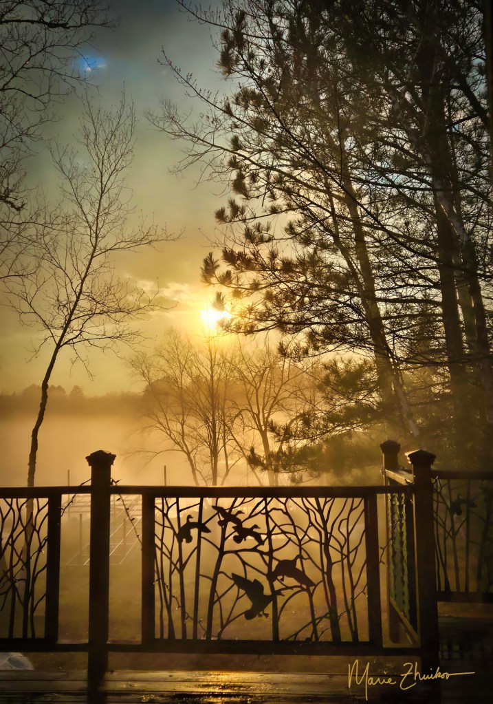 After I returned inside and we ate supper, we watched a television show as the sun began to set. I happened to look away from the TV for a moment and noticed the mist enlarging and glowing in the sunset. Too lazy to venture outdoors again, I just turned around on the couch and snapped the last image in this post out our deck window. (I love how there’s a little spot of blue sky in it near the top.)