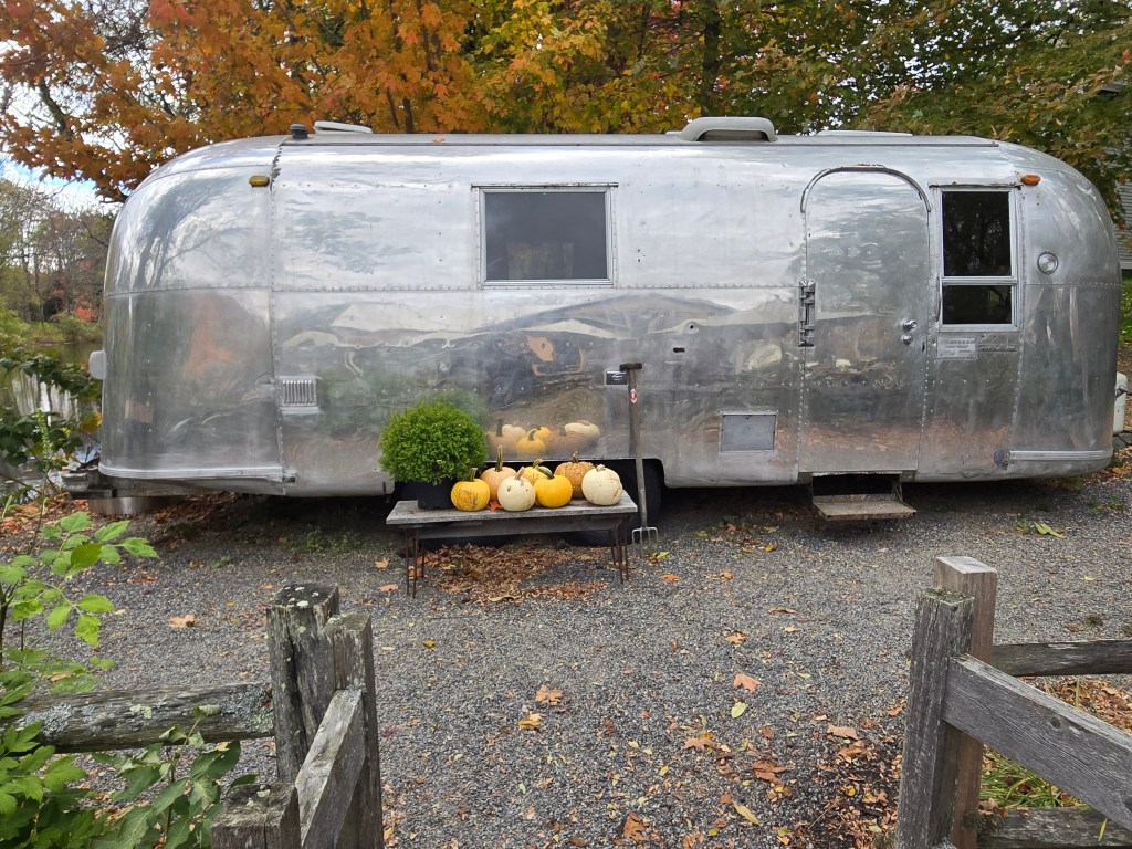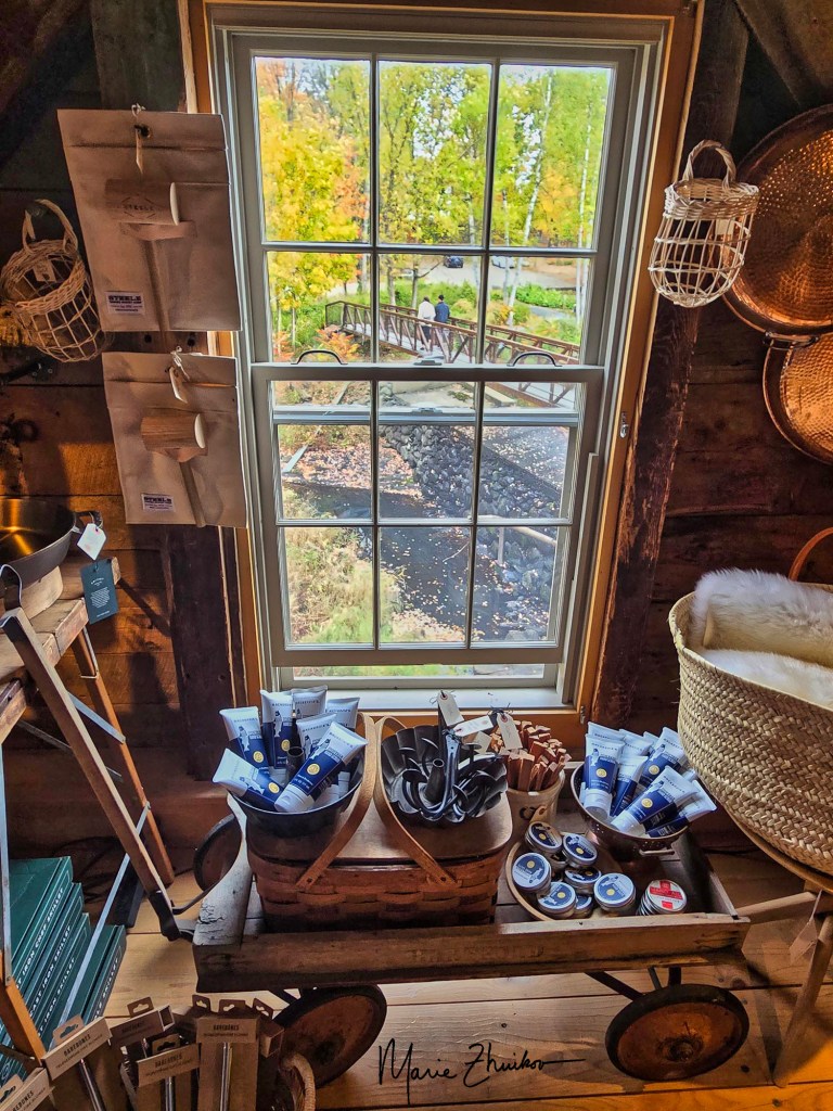 Then we went back outside and wandered around the grounds. We crossed the famous bridge over the mill pond, which is featured in the TV show, and ended up buying yet another scone (not so warm this time) and eating it in the outdoor dining area near Erin’s Airstream.