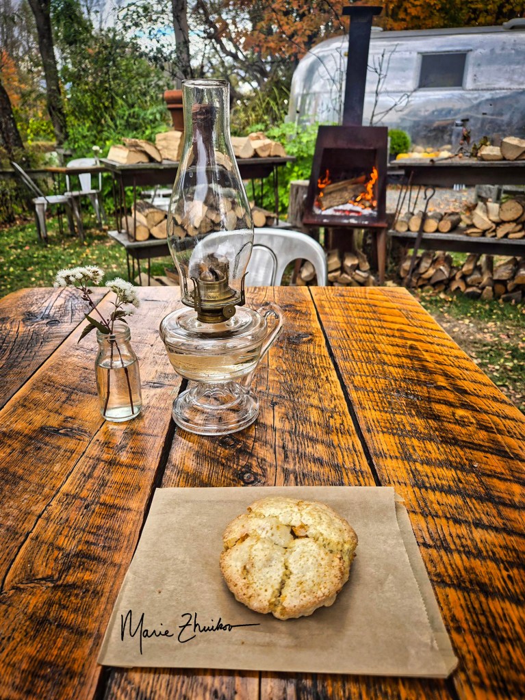 Our fall drive through New Hampshire would have been beautiful except for the leaf colors muted by drought and a viewshed clouded by rainy mist. When we arrived at The Lost Kitchen mill, we visited the kitchen’s café, which features fresh-baked goods and other light lunch fare. We ordered a candied apricot and ginger scone. It turned out to be fresh-from-the-oven warm. OMG, so flaky and good!