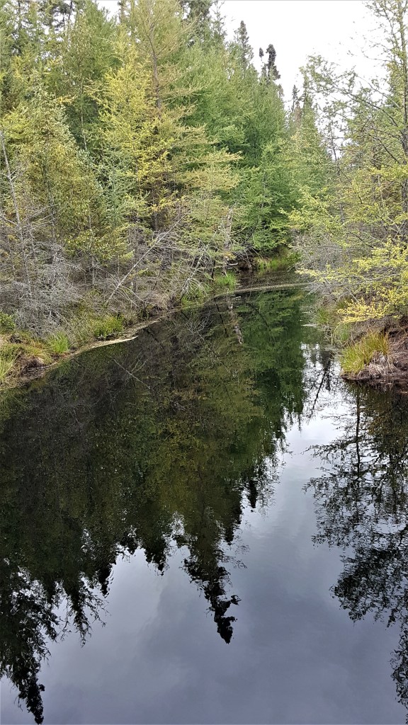 Gray Jay Way ends with a viewing platform where visitors can see the remnants of ditches that were dug in the early 1900s to drain the bog land for farming. Russ and I pushed through the undergrowth for a better look at the ditch junction. The dark bog water lay acidic and still on the landscape, lending an eerie air to the place.