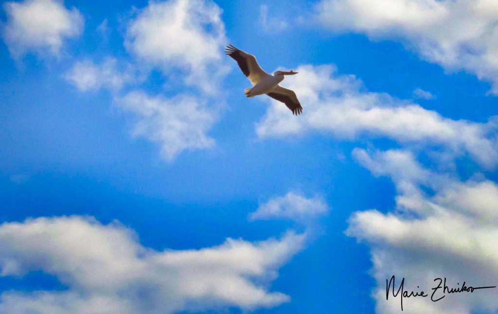 An American white pelican comes in for a landing on the St. Louis River, MN. The bump on its bill denotes that it’s a breeding bird. The bump falls off after the birds have mated and laid eggs.