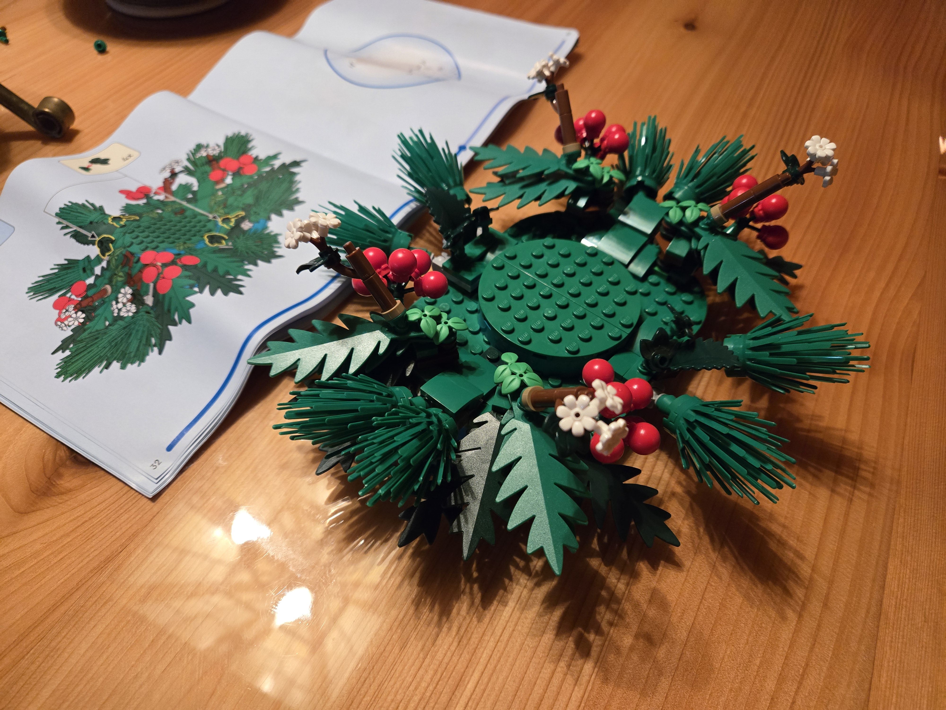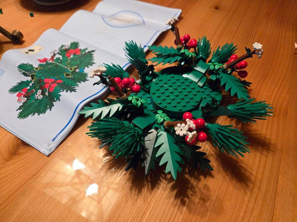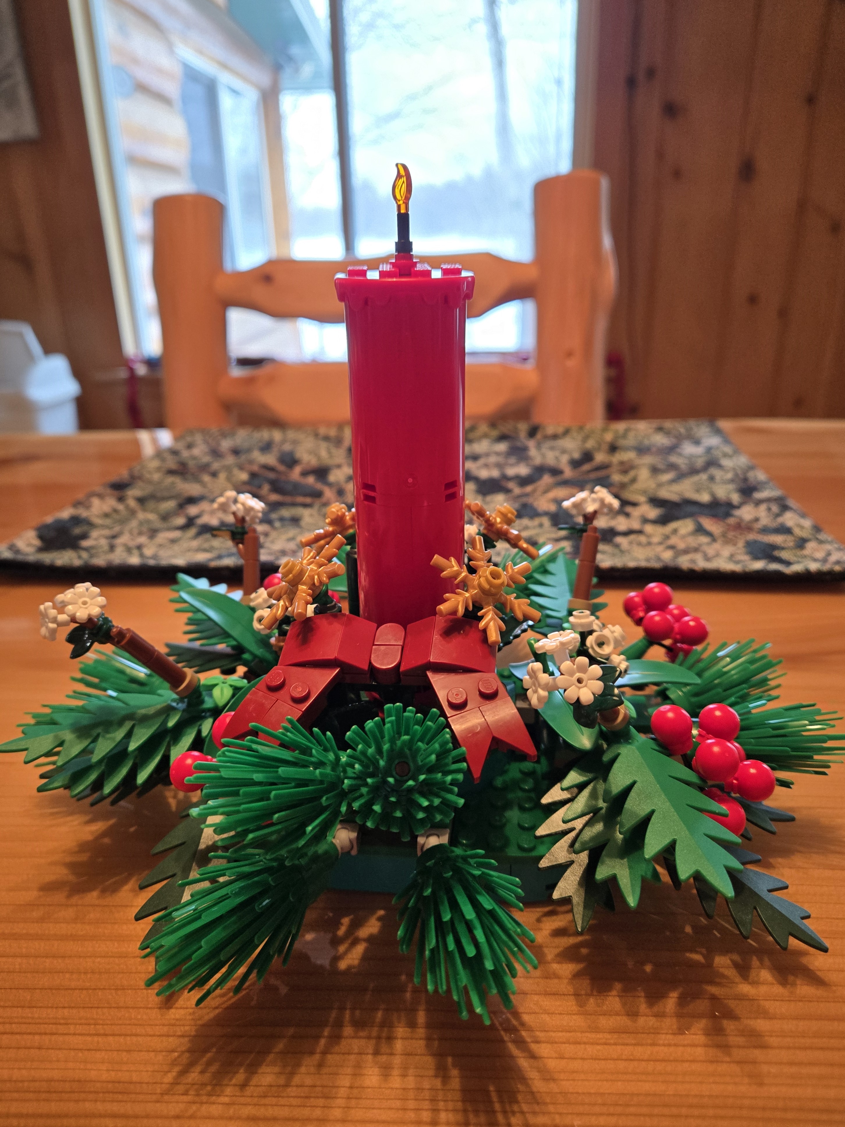 The next day, we carefully and slowly approached the Lego decoration again. It was looking nice, but we dared not touch it for fear something would fall off. We did have more mishaps of that sort, but not as many as the day before. Still, at one point I had to excuse myself because I was getting too frustrated. Russ worked on it by himself (he’s much more patient than I) and made good progress. By the time I dared return, we were working mostly on the candle, which was much easier than the foliage and the berries. We ended up needing to make some modifications to the parts so that the candle would fit properly but finally, after three days, we finished!