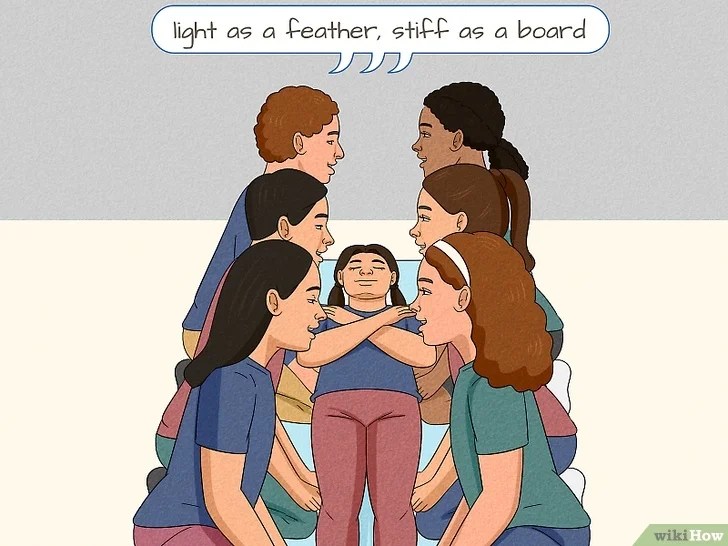After that, everyone puts their fingers back under the person. The leader chants, “Light as a feather, stiff as a board,” repeating the phrase many times. Then the group begins lifting the person slowly. Unlike the first lifting attempt, this one should happen easily and for only a few inches. Then the group lowers the person back to the ground.