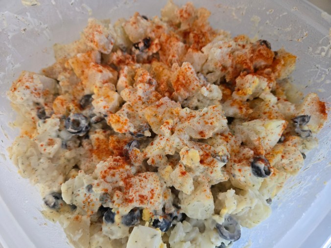No 4th of July is complete without my mother’s potato salad recipe. It features extras like black olives, hard-boiled eggs, mustard, onion, dill, and paprika. I made enough to last our crew for several days!
