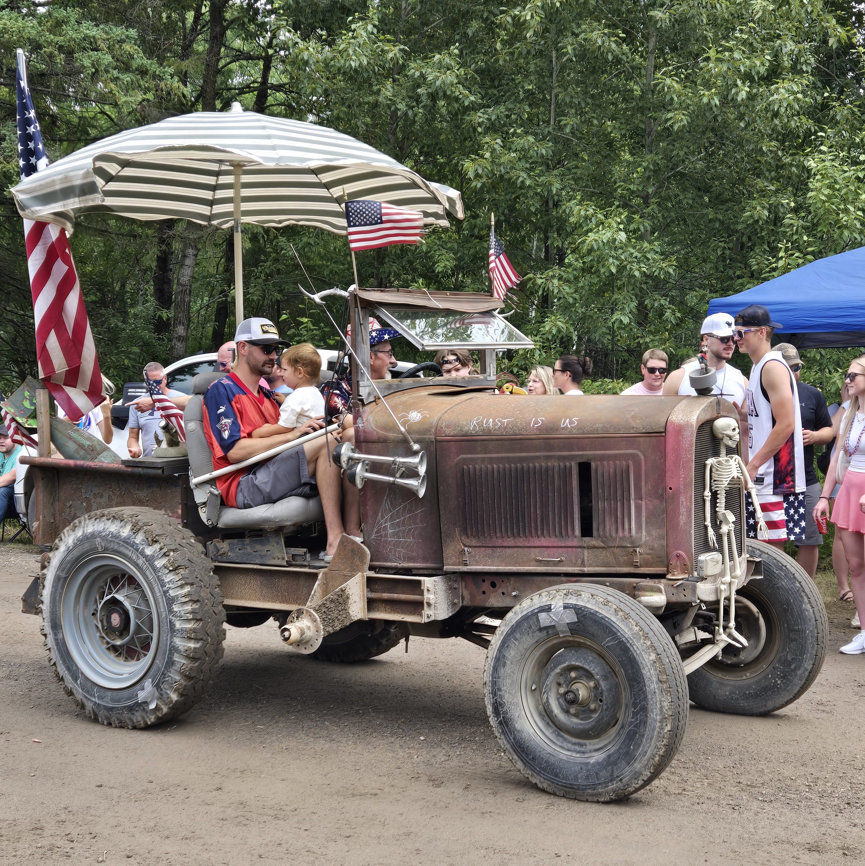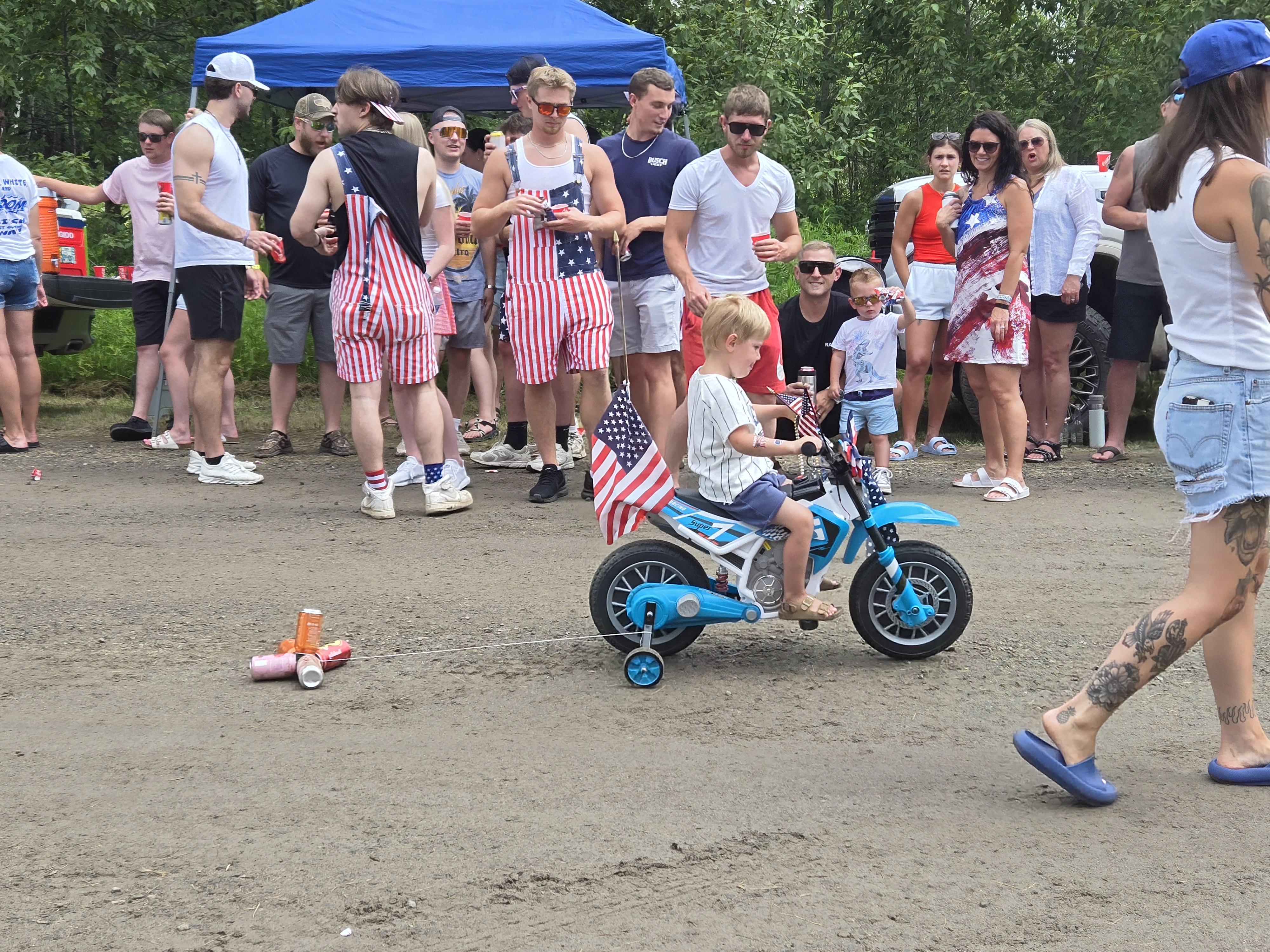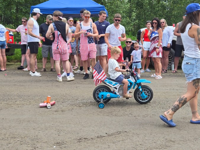 This was the cutest float in the parade. While many of the ATVs were trailing beer cans, he chose pop cans. Note the patriotic dudes in the background.