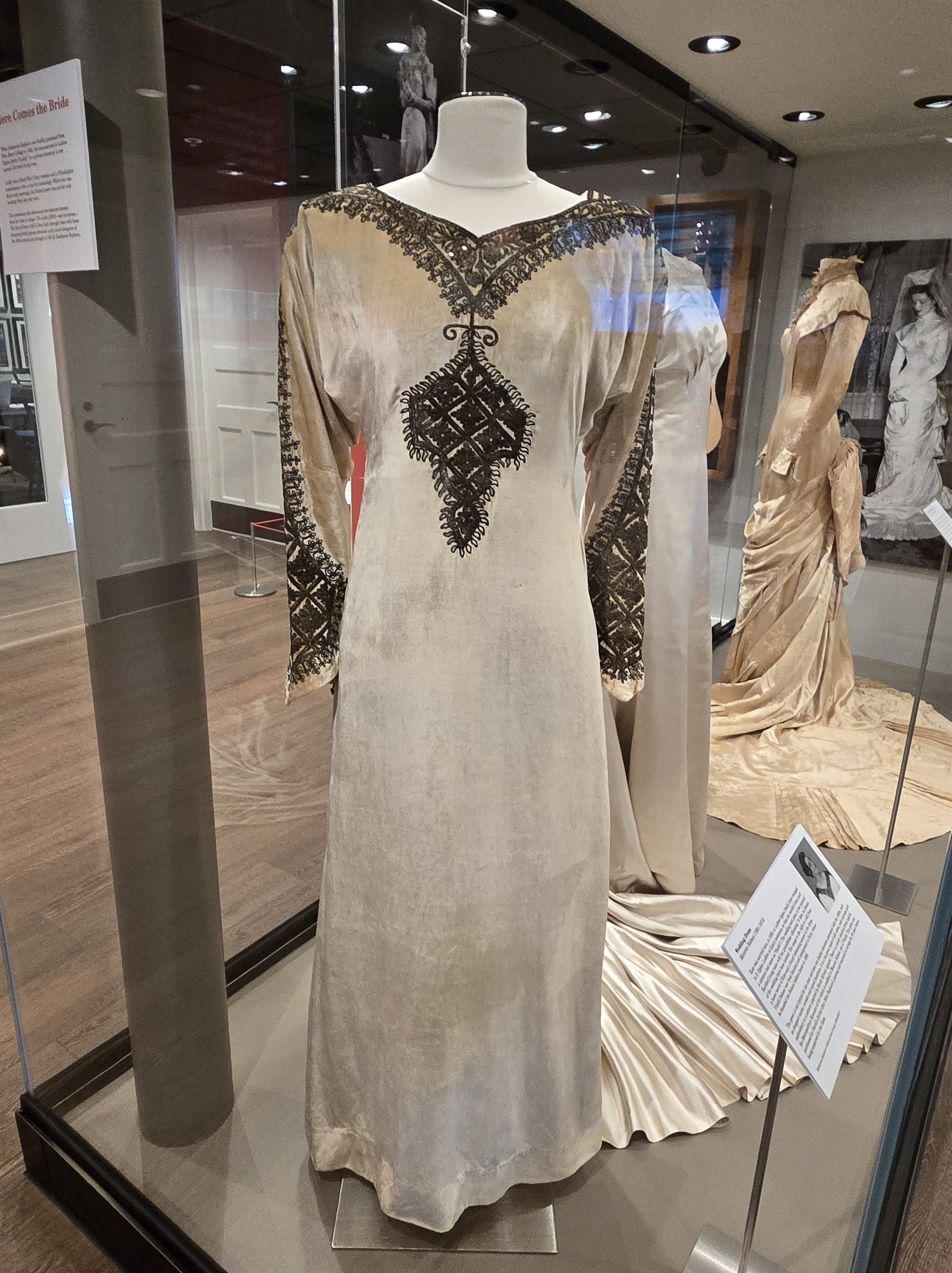 Kate’s wedding dress. It’s a tea gown made of silk velvet with gold embroidery in a pattern inspired by North African apparel. It was purchased by a wedding gown company and remained in storage for 20 years before being purchased by the museum.