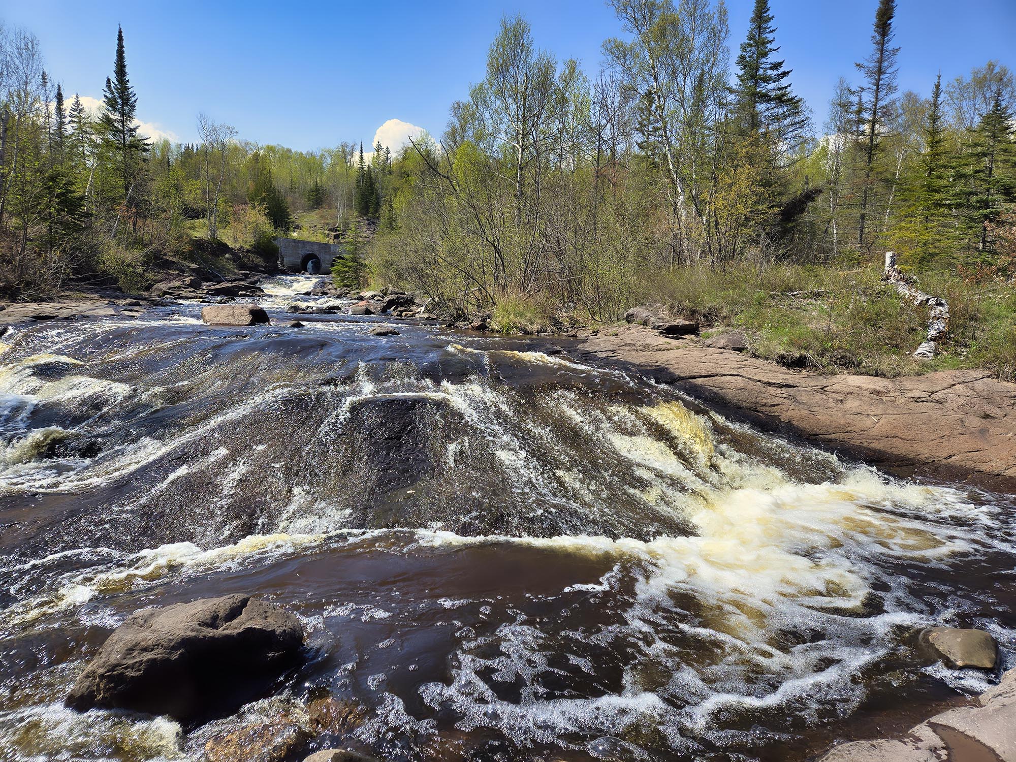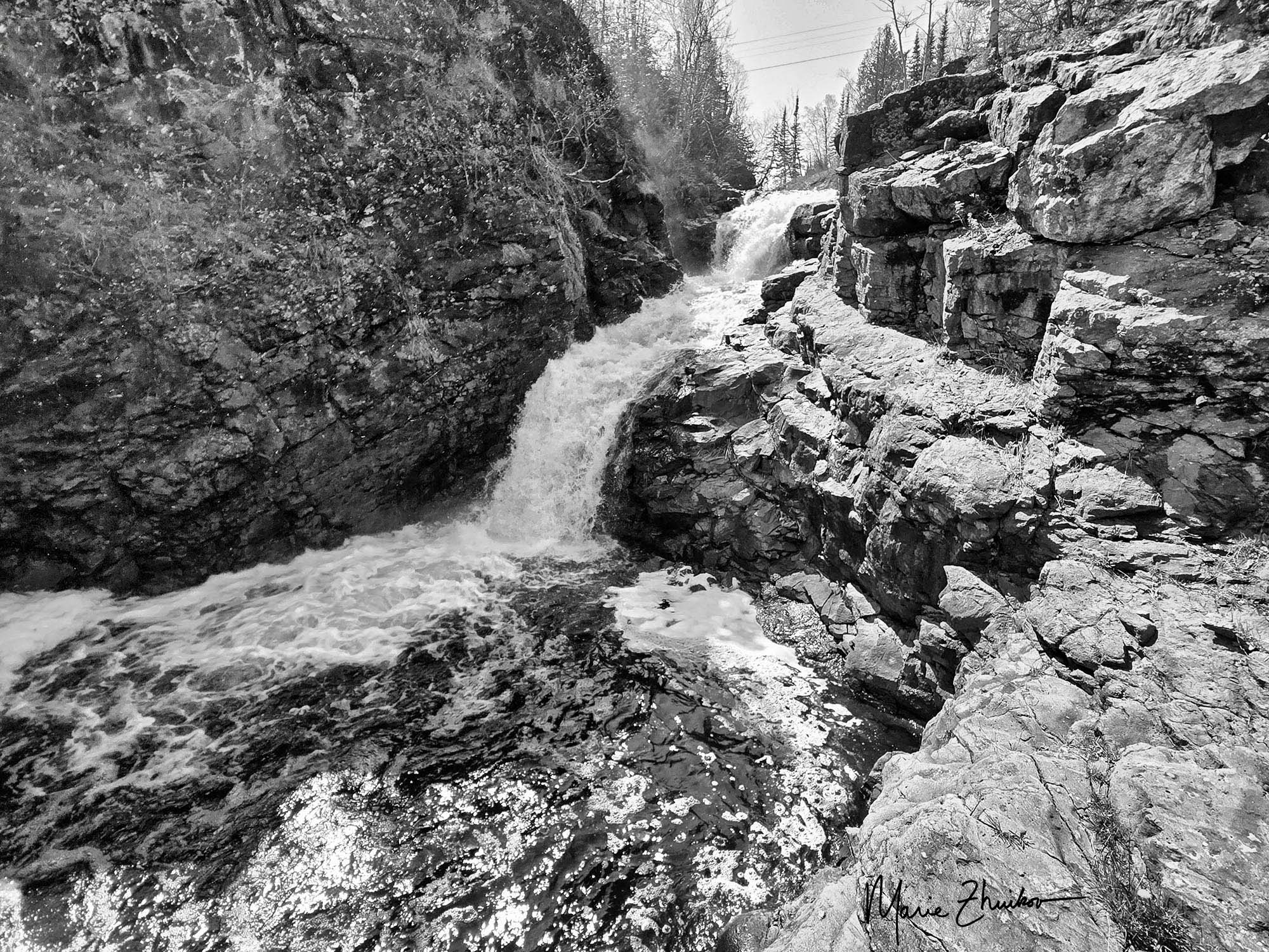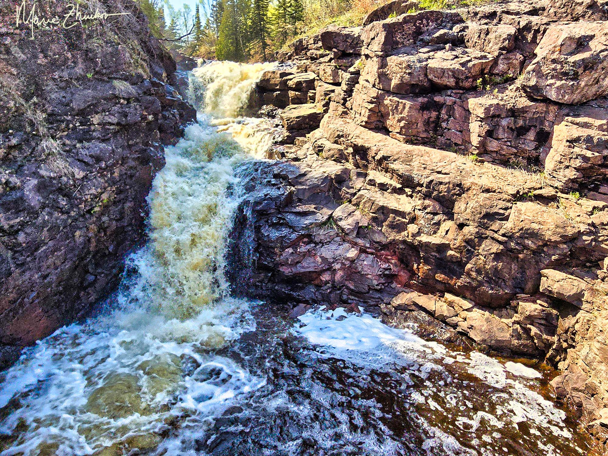 We’ve been driving up and down Highway 61 on Lake Superior’s North Shore more than usual lately to deliver and retrieve my photos that were on display in Grand Marais. On one trip, I noticed a river that flowed underneath the highway. No sign sported the river’s name. Looking landward as we whizzed past, I spotted a double culvert bridge about a hundred yards away that the river flowed through. Was that a waterfall behind one of the culverts? The scene was intriguing and not one I’d ever seen photographed by established North Shore photographers. I made note of the location and vowed to stop on our next trip.
