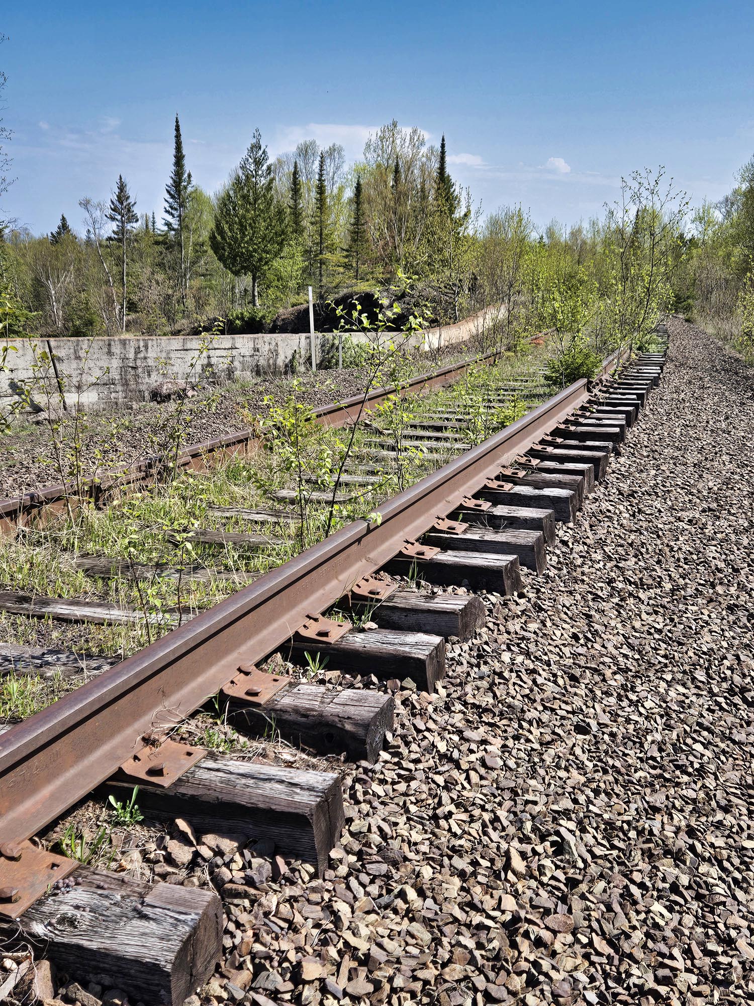 Waterfall appreciation over, we investigated the railway bridge. Like the driveway gate, the railroad was overgrown with saplings and obviously hadn’t been used in years. Research I did while writing this post uncovered the facts that the railway was named the Cliffs Erie Railroad. The last train operated in 2001, but after that, cleanup trains, which collected leftover chips and pellets from the mines, operated until 2008.