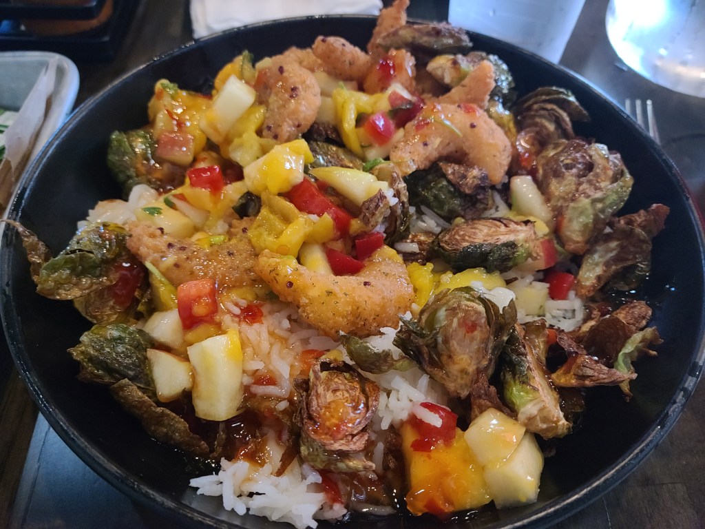 The shrimp mango rice bowl from Pedal Pushers Cafe in Lanesboro.