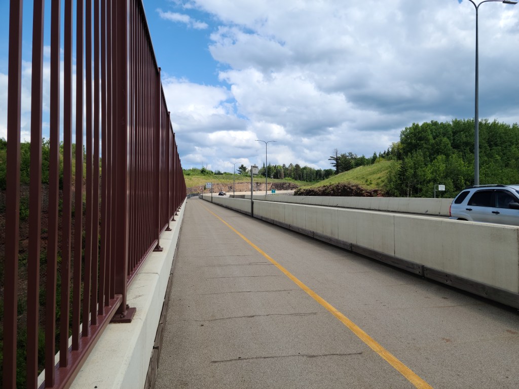 Eventually, we reached the bridge. One side of the trail is for walkers and bikers. The other side of the painted line is for ATVs. A low concrete barrier separates the trails from the freeway. A high railing on the outside provides protection from dropping 200 feet but still provides a view of the Rouchleau Mine Pit below. This mini Grand Canyon was created by iron ore mining activities and now provides drinking water for the city of Virginia.