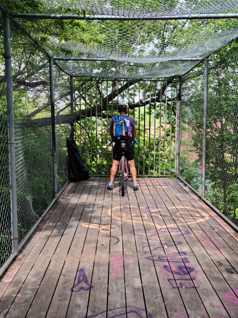 Once we biked to the outskirts of Virginia, we stopped to investigate a rather overgrown overlook of the mine pit that features a 50-foot caged safety bridge out to the pit’s edge. It’s named the Oldtown-Finntown Overlook.