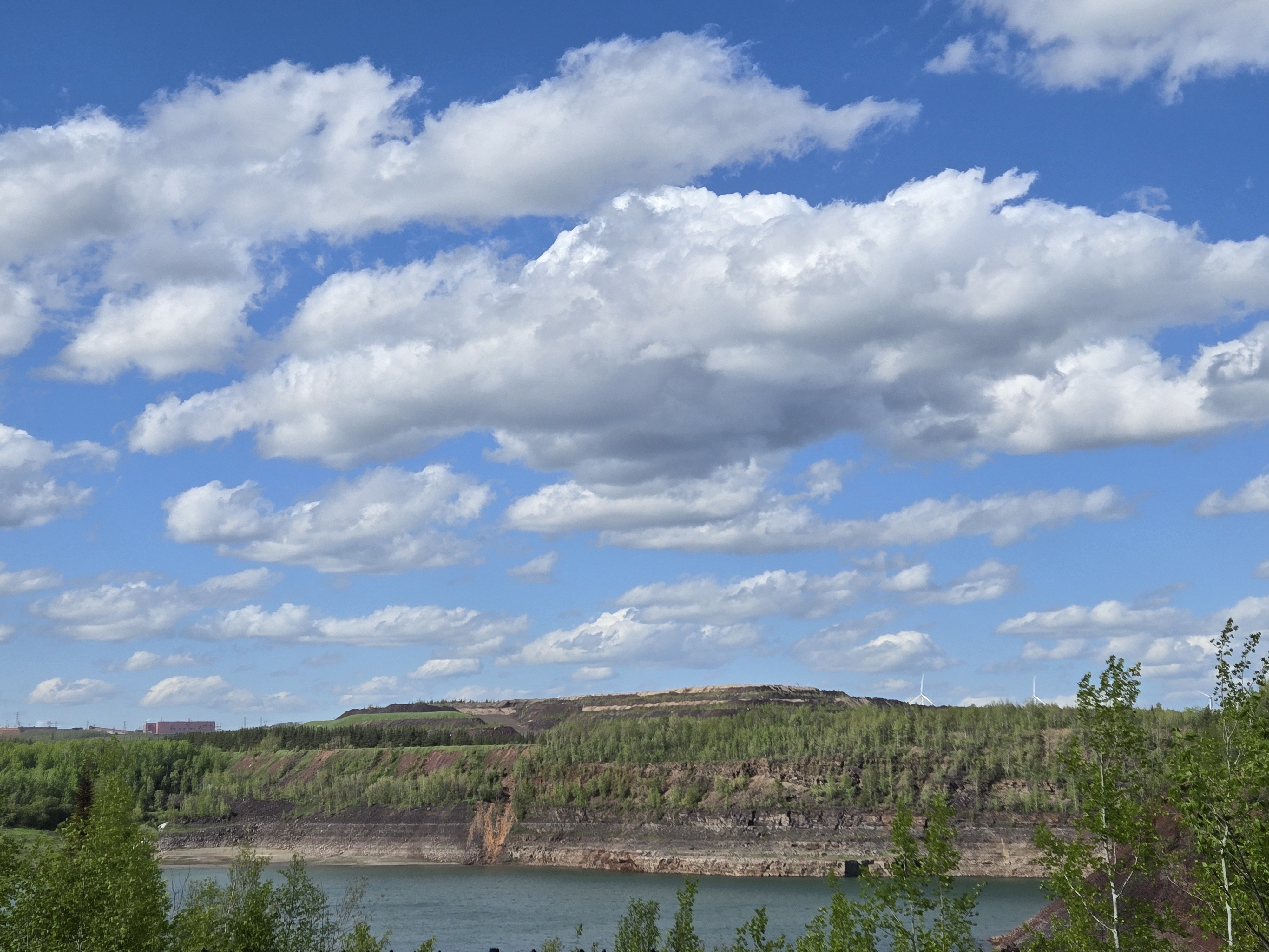Compared to other sections of the trail we’ve biked, this was more civilized. Once we passed the abandoned neighborhood, a few occupied homes lay along the trail. Huge grassy piles of mining tailings lined the horizon. Although a sign along the way says that tailings are not a health hazard, I don’t believe it! We saw a lined basin where it seemed like water was being pumped from the base of the piles. I couldn’t find any info about that online, but I am hoping it’s so the water can be collected and treated before being released into the environment. For much of the way, the trail parallels a highway, although it’s often hidden from view by trees.