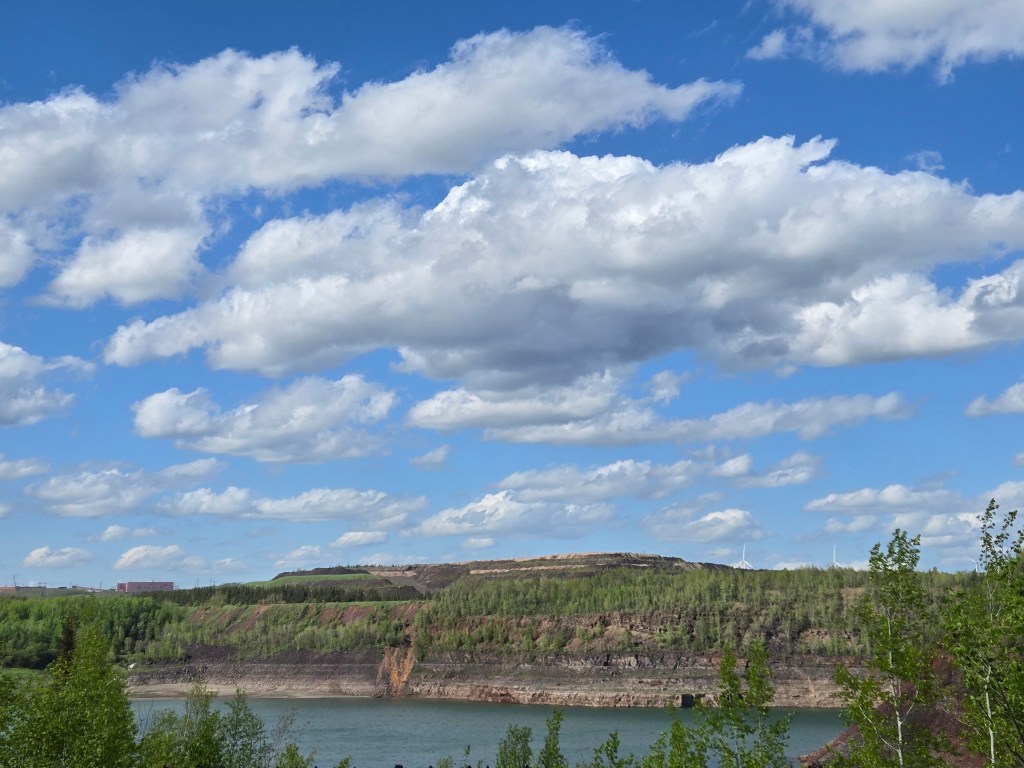These days, instead of iron ore, Mountain Iron is known for wind energy. Several turbines spin on far hills. They are part of the Taconite Ridge Wind Energy Center – the first commercial wind center in northeastern Minnesota. An interpretive sign in the park says, “In ideal wind conditions, 10 turbines can collectively capture the wind and convert it into 25 megawatts of electricity – enough to power 8,000 homes on an annual basis.”