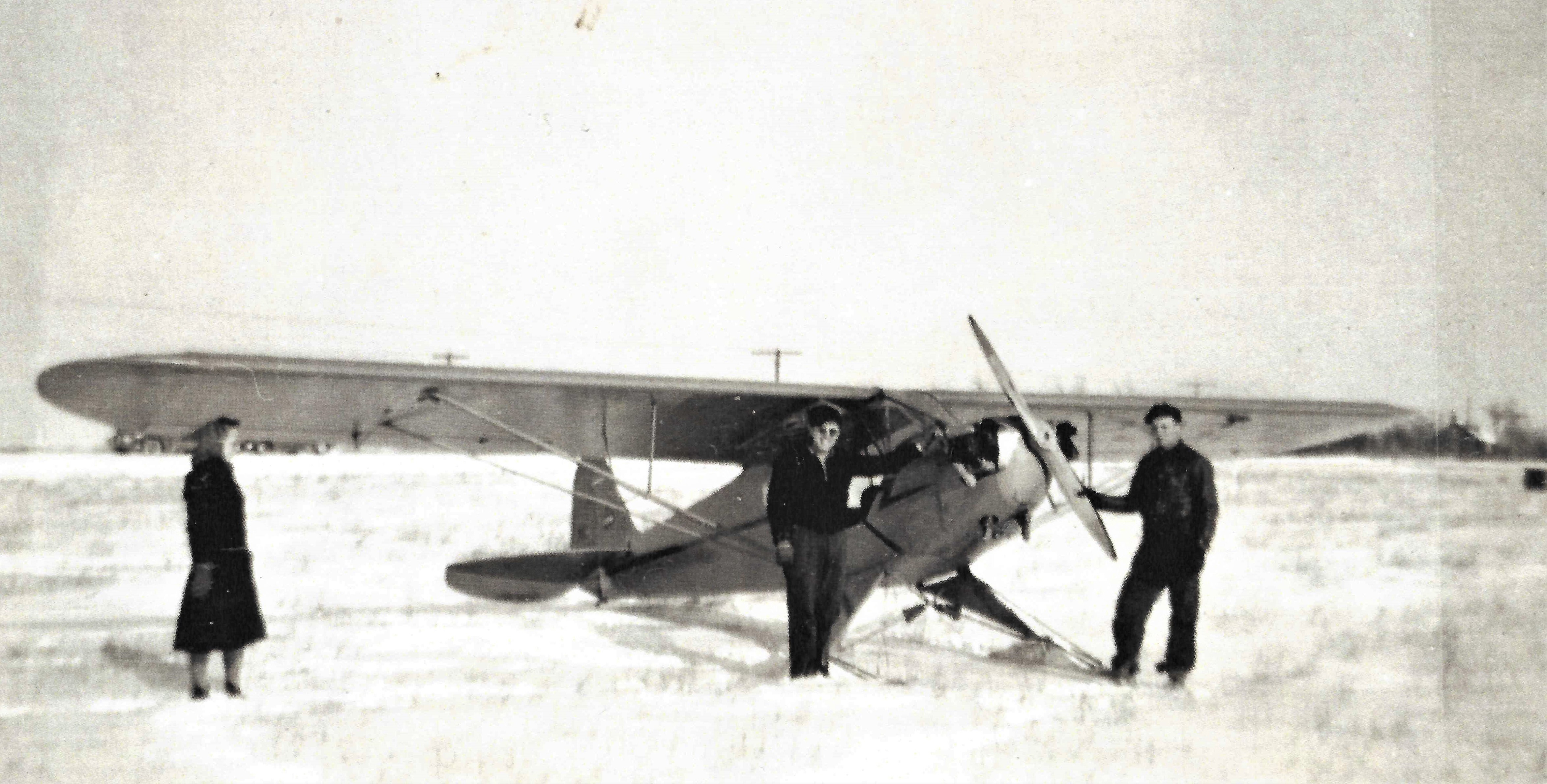 David Potter (left) and Dick Potter stand by their Piper J-3 Cub. The woman is unknown.Potter Family photo.