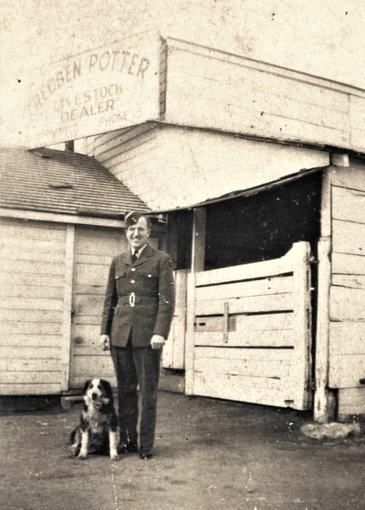 David Potter on leave from the RCAF at the Potter Stockyards in Springfield, Minnesota with a trusty dog by his side. Potter Family photo