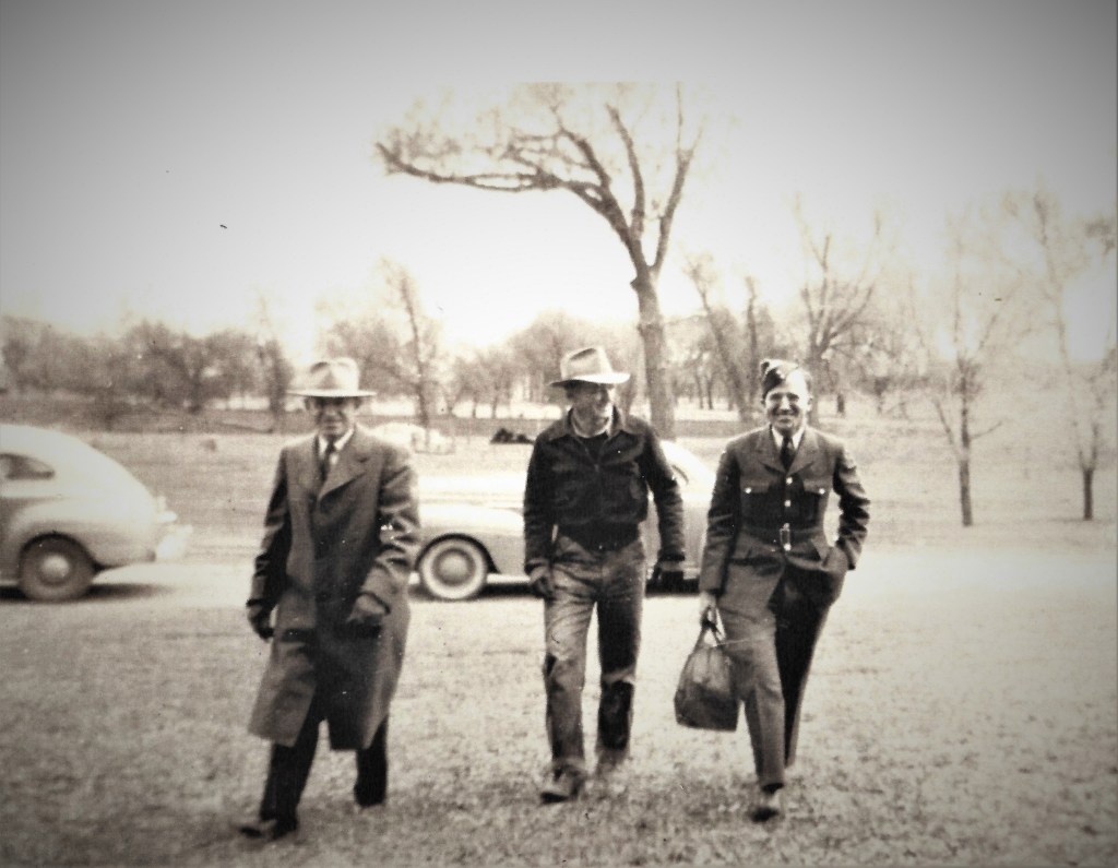 David (right) home on leave from the RCAF. Brother Dick is walking next to him, then his father Reuben. Potter Family photo.