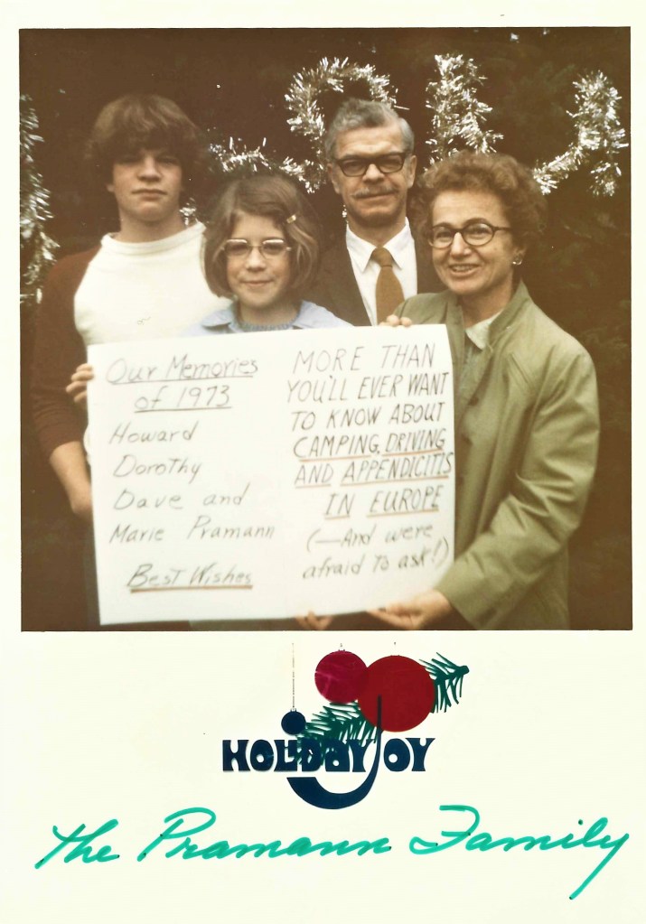 Our family Christmas photo, 1973. In front are Marie and her mother Dorothy, in back are brother Dave and father Howard. Pramann Family photo