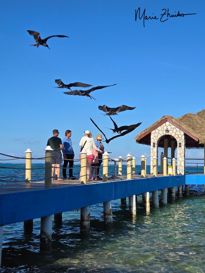 We happened to be passing Tukka Restaurant (where we ate the previous day) at 5 p.m., when they feed the frigatebirds. We hung out in hammocks on the shore and watched the large and acrobatic black birds swoop down for restaurant scraps. Recycling at its finest!