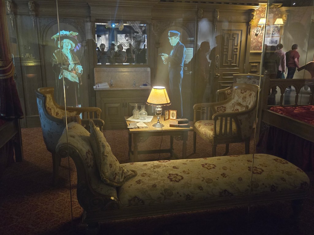 A replica of a first-class state room on the Titanic, complete with hologram passenger and staff member.