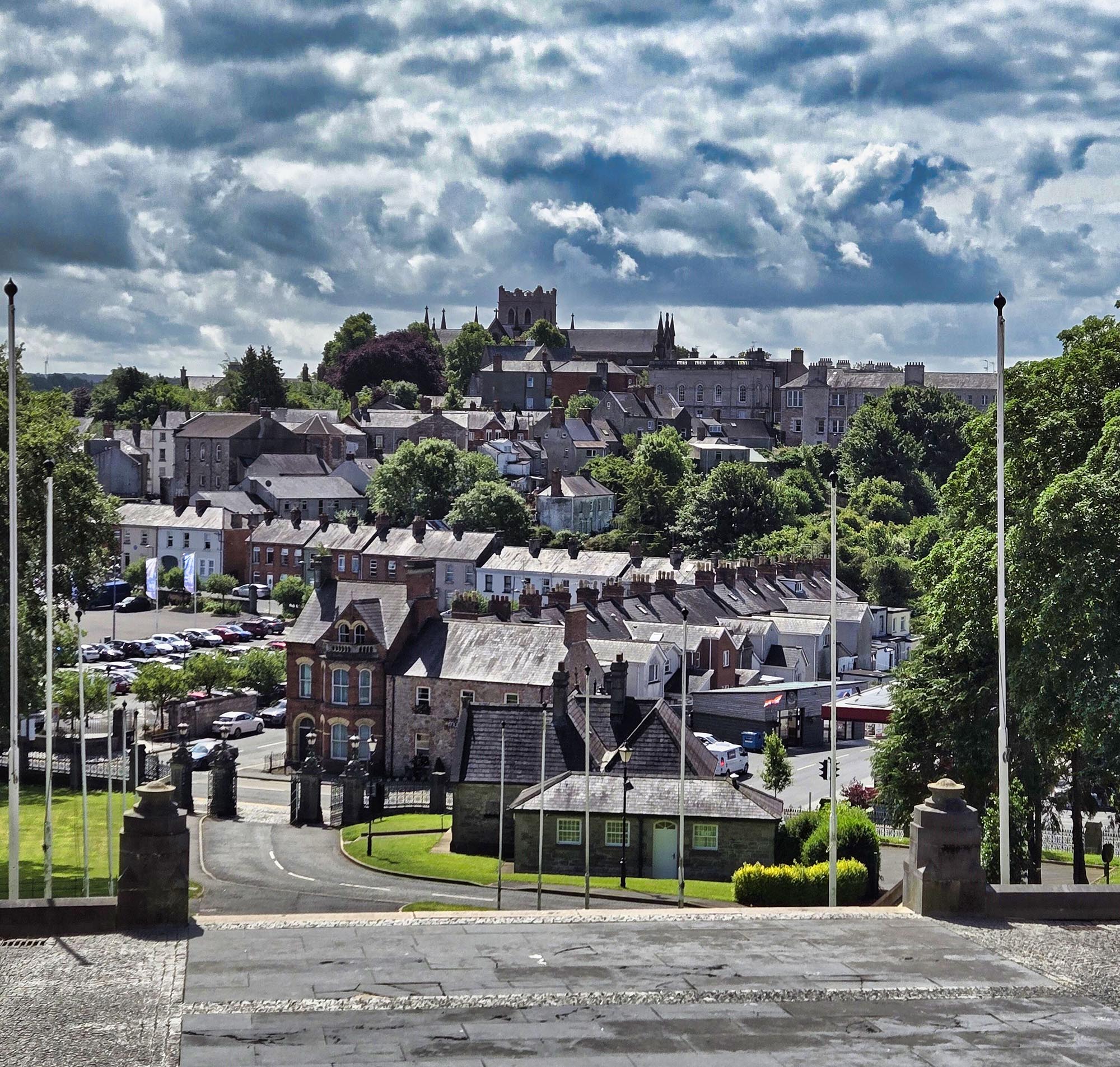 The town of Armagh and St. Patrick’s Church of Ireland Cathedral as seen from the steps of St. Patrick’s Roman Catholic Cathedral.