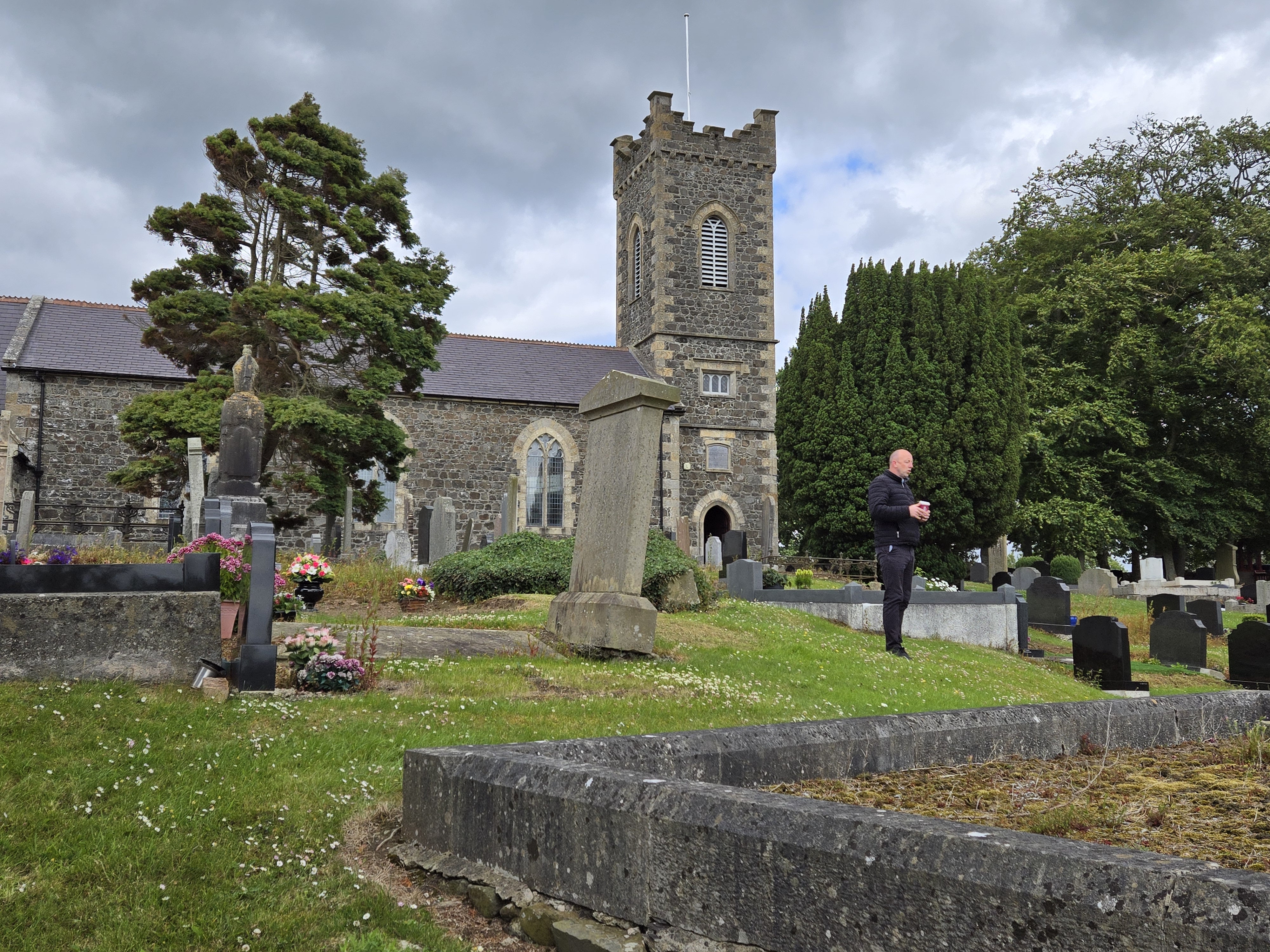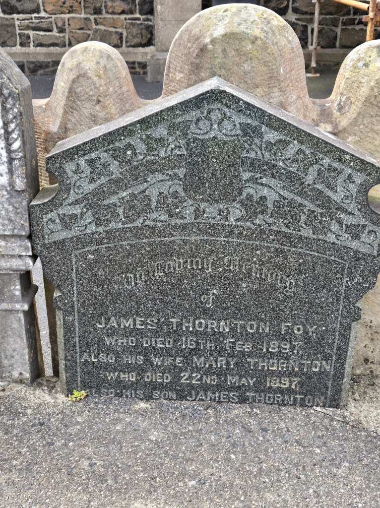 As we strolled around the graveyard, which smelled of manure from the cows nearby, we noticed a broken headstone propped up against the low stone wall that borders the yard. It was the headstone for JamesHenry Thornton and Mary. Mary must have been James Henry’s second wife! The last line on the tombstone says something about their son James Thornton, who was thought to have lived in Australia. Maybe he returned home to Ireland, eventually? The church member who let us into the building for a tour said that the stone must have been broken in the past, so that’s why it was leaning up against the wall and not over their gravesite. He said they do that instead of just getting rid of the broken ones.