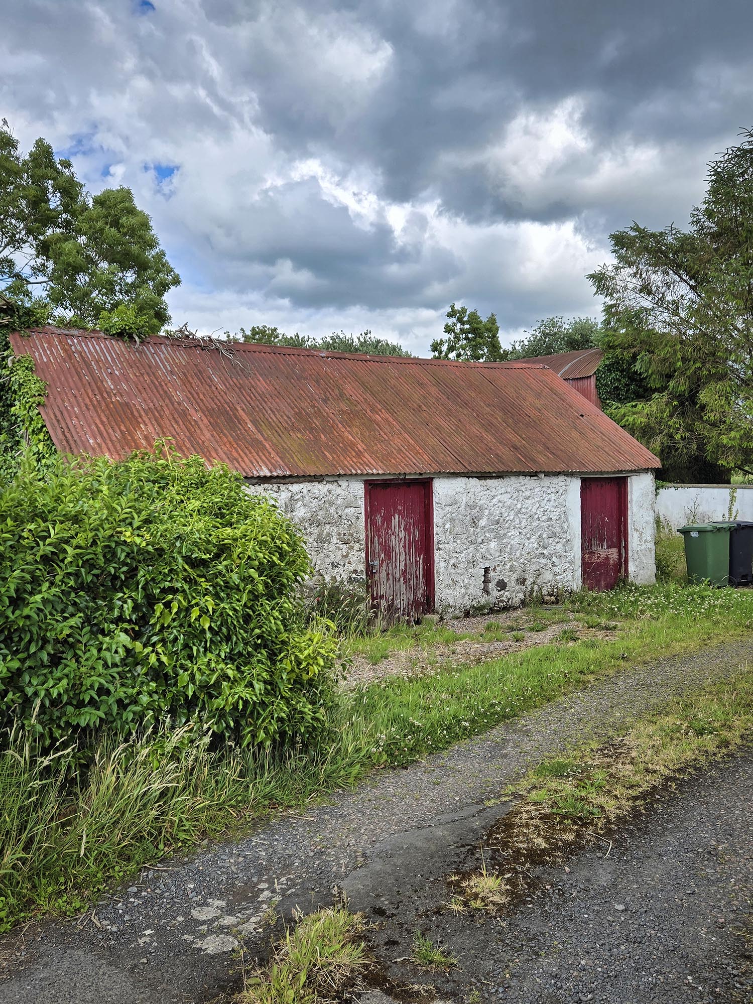 As if discovering this significant gravestone wasn’t enough, our talkative guide Ian next took us to the homesites of Russ’s ancestors. Two out of three weren’t accessible or there was nothing to see but an orchard, but the Thornton homesite was different! We peered down a driveway that led to a modern house. Between the driveway and the house was an old white building with red doors and a rusting metal roof. This was where Russ’s Thornton ancestors lived! It looked more like a shed or a barn now than a home.