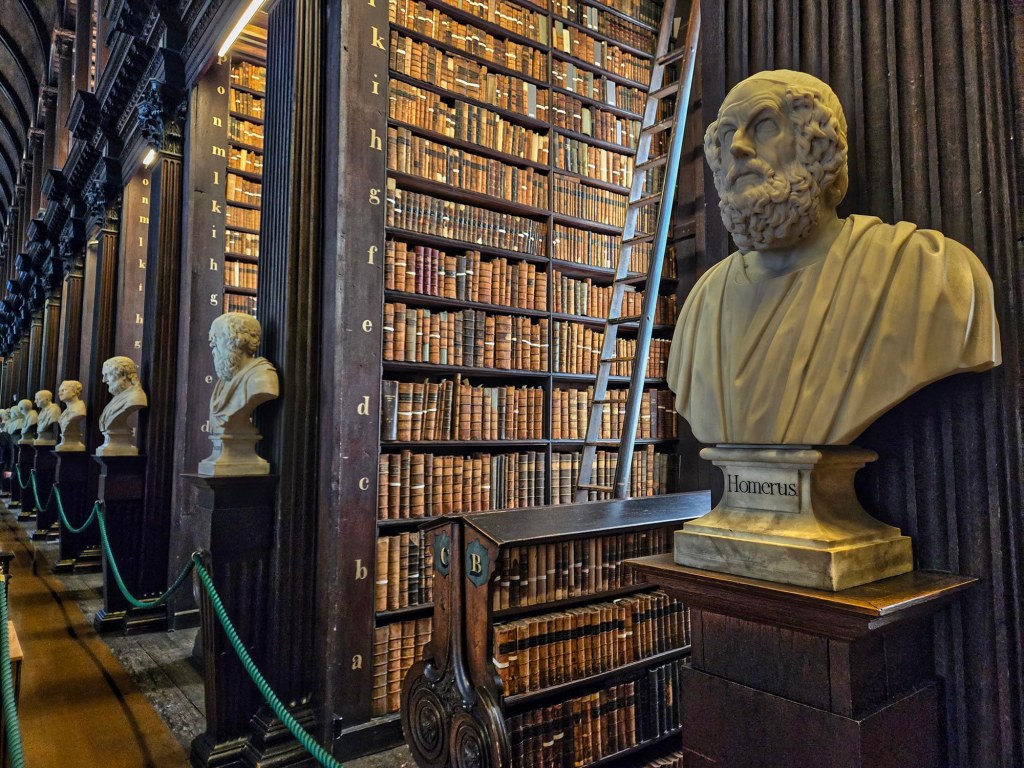 Shelves that still contain books in the Long Room. It also features busts of many great historical minds — mainly men, but a few token women have recently been included.