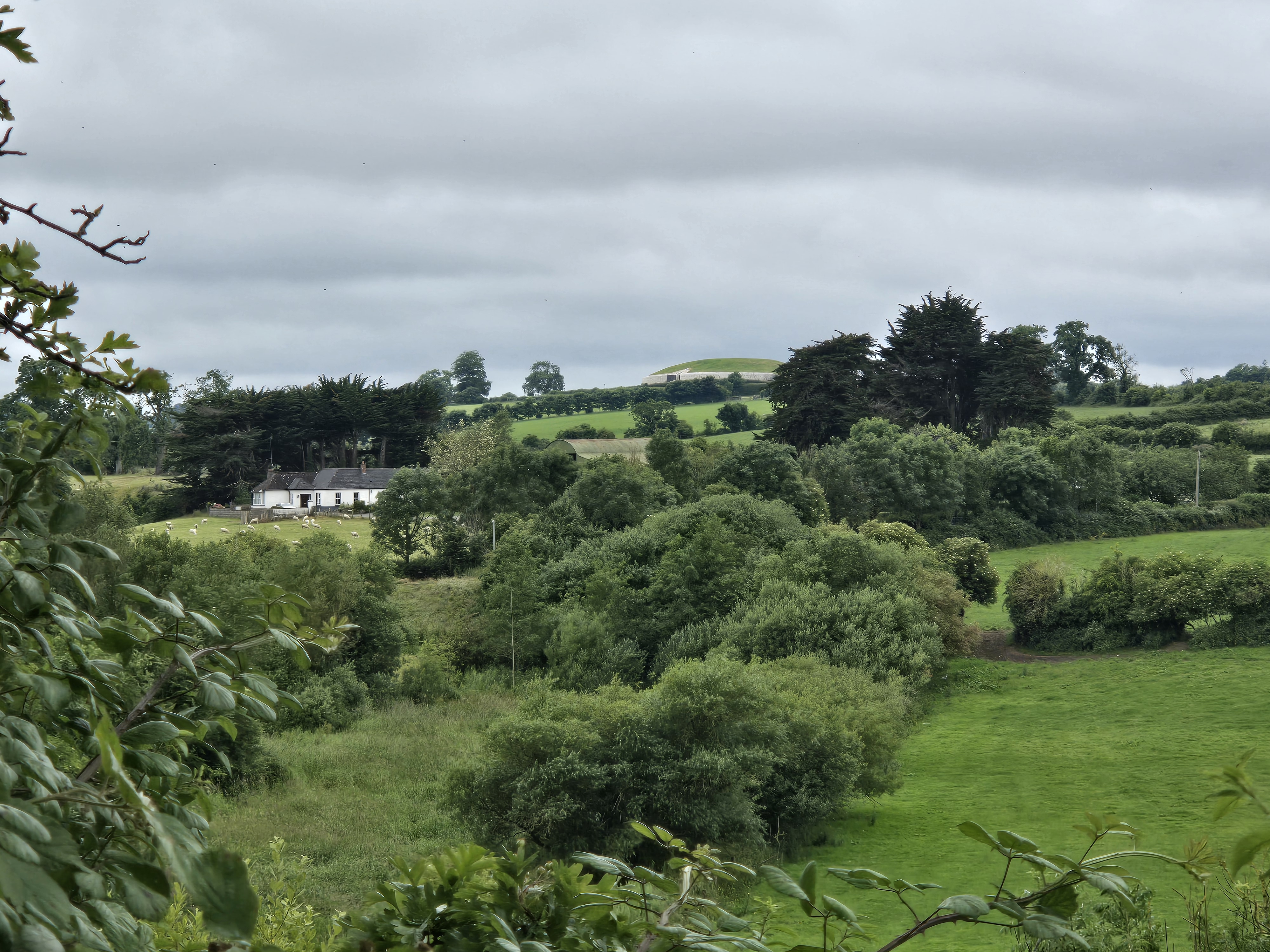 Newgrange seen in the distance from the banks of the River Boyne.