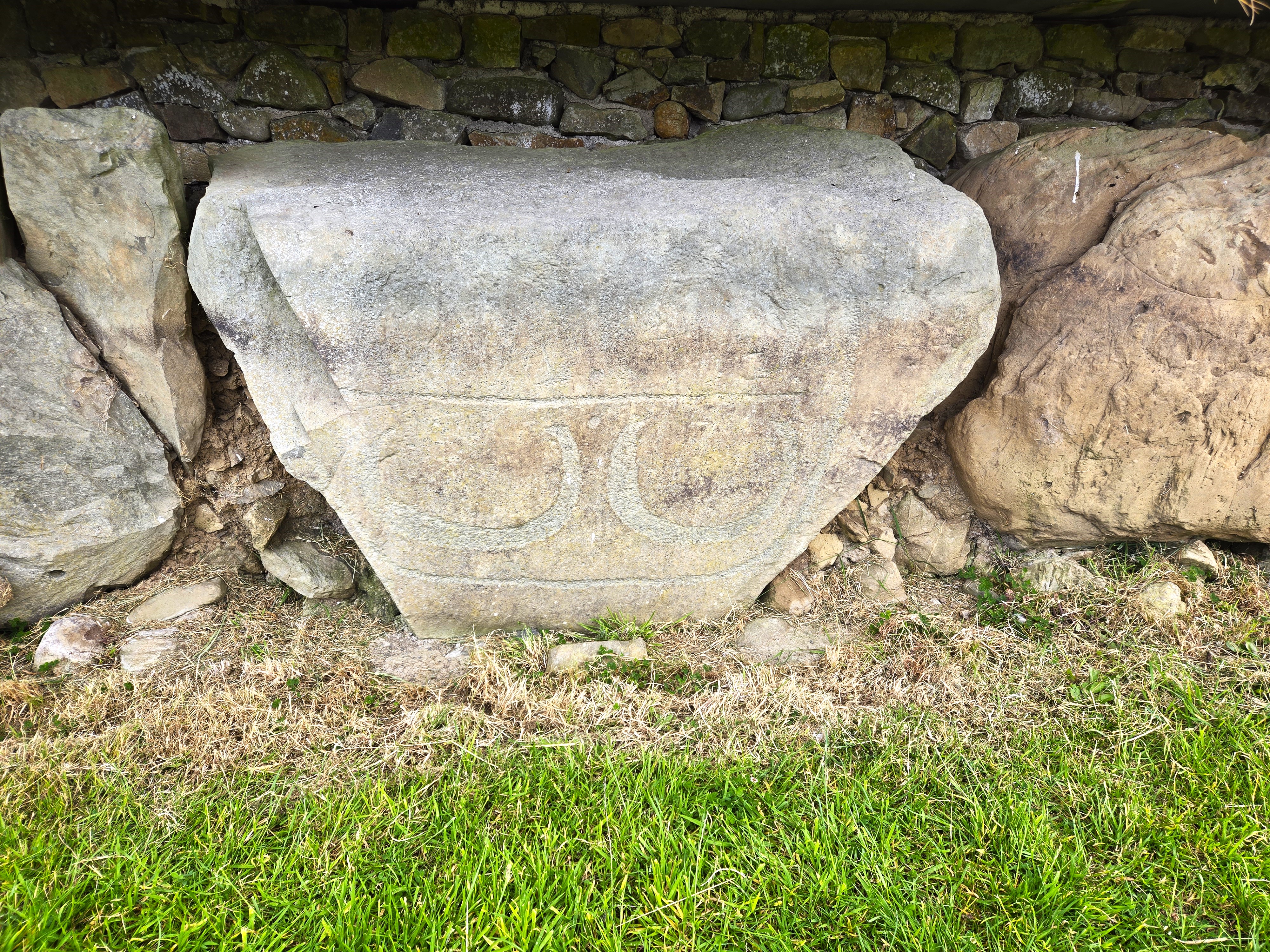 A large oblong stone lays on the ground at the entrance to the Newgrange chamber. It features at least spiral designs, which are thought to represent different life stages: birth, death, rebirth; or birth, adulthood, and old age.