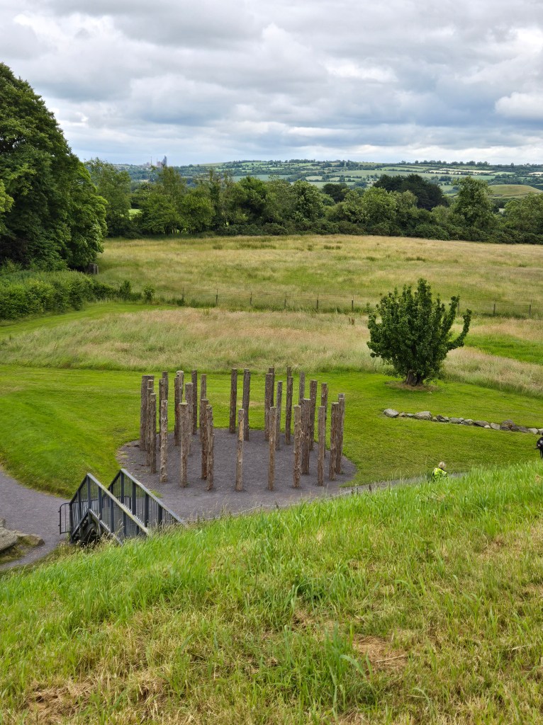 Close to the Knowth mound and off to one side is a wooden henge. Surprise 3 to me was that there used to be such things. I thought all henges were built of stone. The original henge was made of oak trees, but the modern recreation features spruce tree trunks. Our guide said that when the site was used for rituals, tables were in the middle of the henge sheltered by a tarp. The bodies of the dead were laid on the tables for decomposition, I assume before they were moved inside the mound. The guide also said that the remains or cremains of 200 people have been found in the mounds and that Knowth mound was used as a giant refrigerator. Nine “sutrains” — things like little root cellars—were dug into the sides of it for food storage.