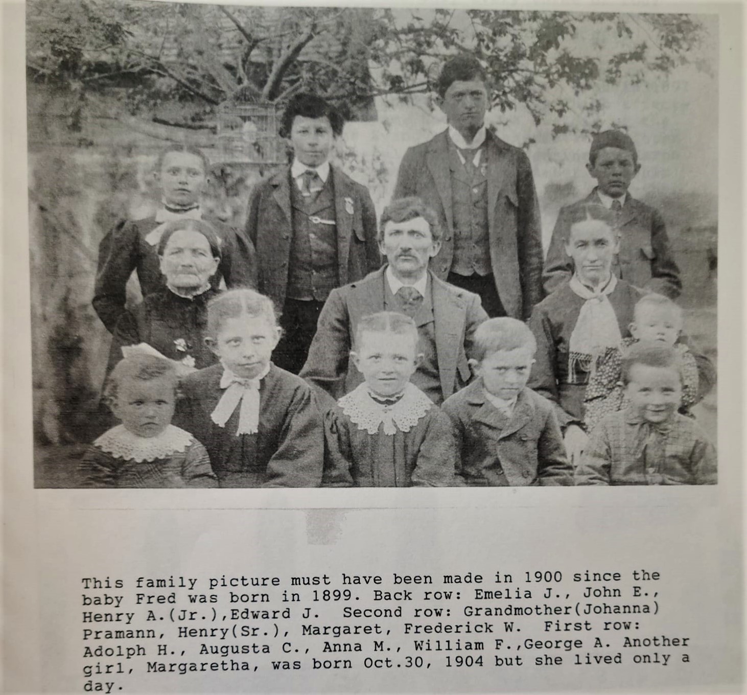 The “founding couple” (my great-great-grandparents Johan and Johanna Pramann) immigrated from Othfresen Germany. It’s speculated that they left, even though Johan’s family were the major landholders in the area, because Johan would not inherit the land because he was not the oldest son. Apparently, there was a tradition that the oldest son inherited the land and the younger sons were given money to build a house in town. Maybe that wasn’t good enough for Johan, so he came to the United States to seek his own land, with his wife and a foster daughter (Augusta, age six) in tow.