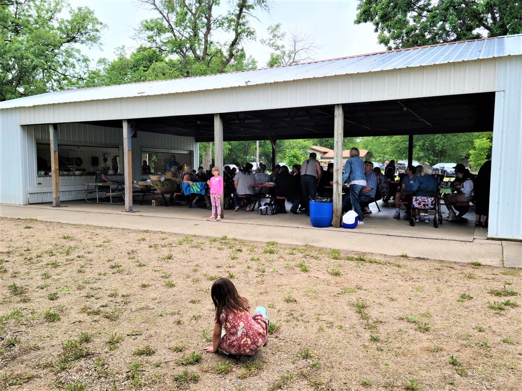 The Pramann Family Picnic meeting commences in the Fair Haven city park picnic shelter, 2022.
