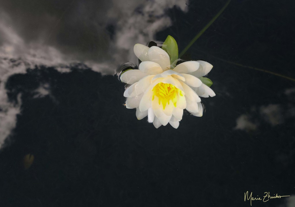 Once back on land, I excitedly viewed my photos. One turned out just as I had hoped. Although the plant stem and a leaf are discernable underwater, it looks like the lily is floating on a dark sky with white clouds. I hereby dub it, “Sky Lily.”